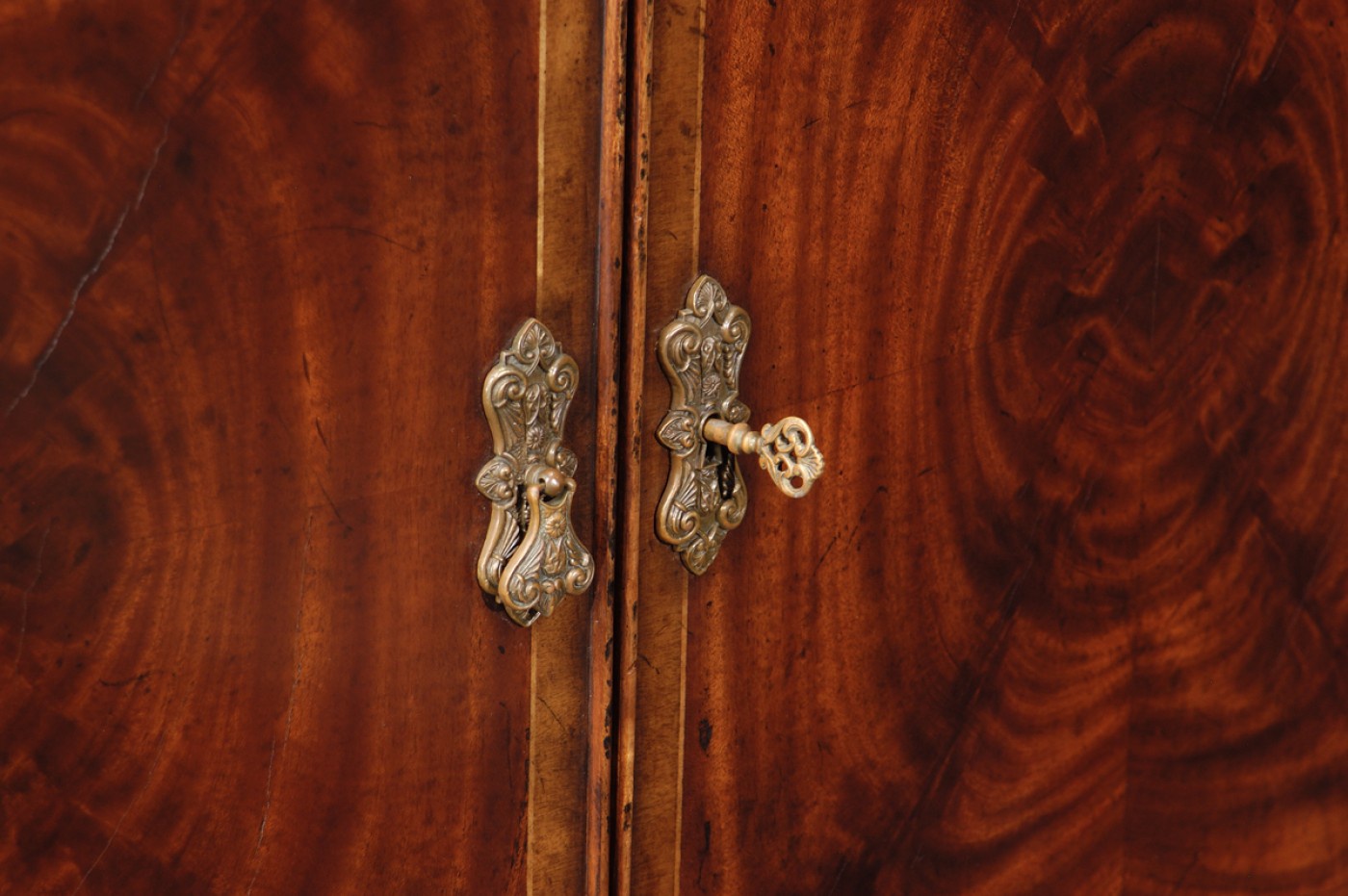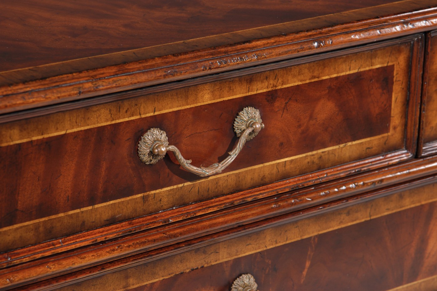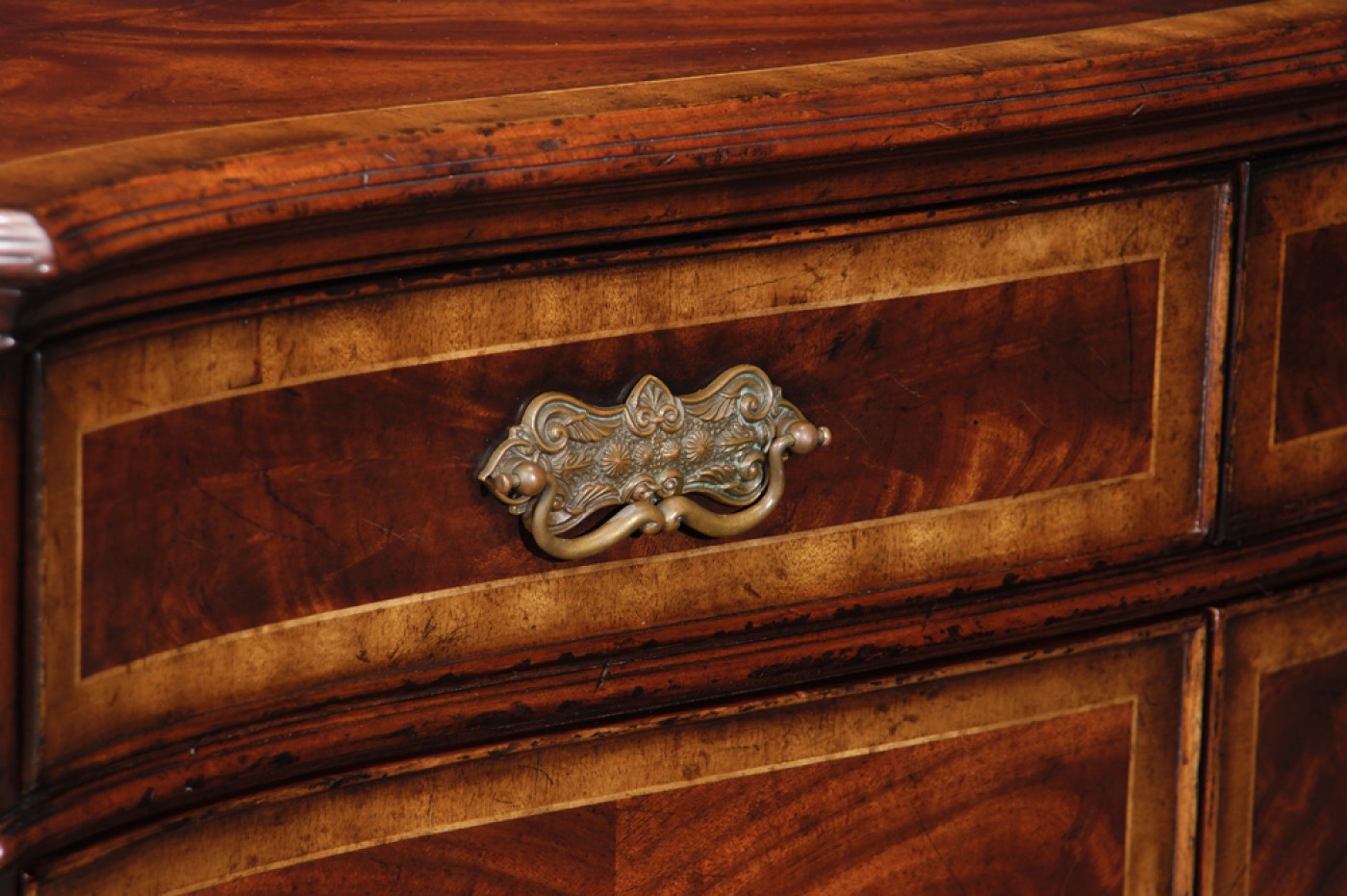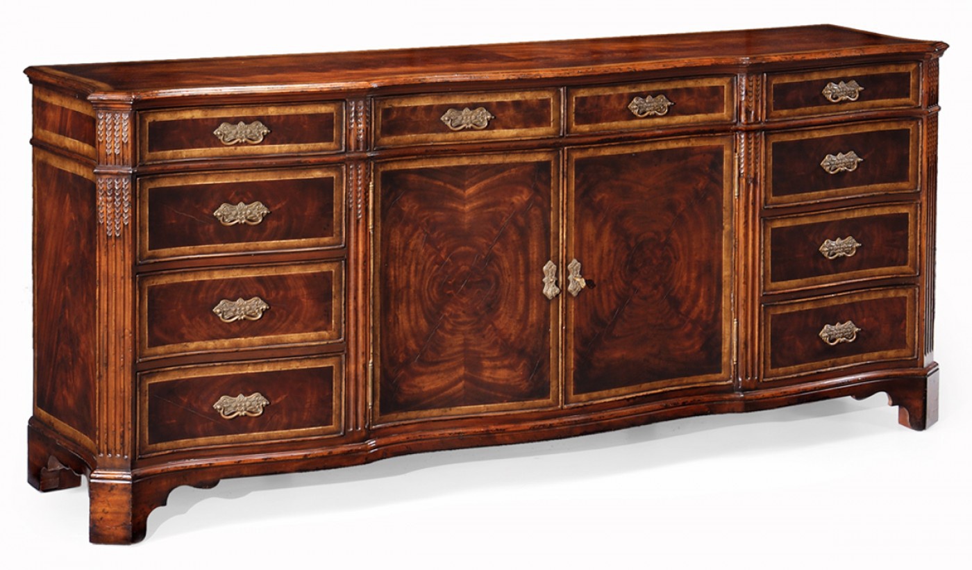 Buckingham buffet from an American manufacturer Jonathan Charles. Model on legs with a wavy facade. The angles are softened by carved columns. The pantry comes . The body is made of wood and veneered mahogany. Fittings made of patinated brass.