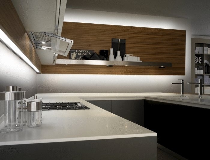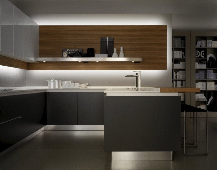 Kitchen High teak from the Italian manufacturer Salvarani. The model is made in modern style. The frame is made of MDF, finished veneer or lacquer from the company portfolio. Completion of the project in the combination of desired finishes and colors in order according to the customer.