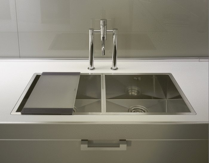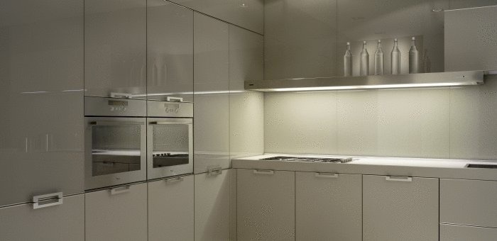The PK from the Italian kitchen manufacturer Salvarani. The model is made in modern style. The frame is made of MDF, the facade was decorated with veneer or lacquer from the company portfolio. Frame fronts and brackets from aluminium. The table top is made of stone. There is nothing superfluous, all is laconic and is subordinated to the General mood.