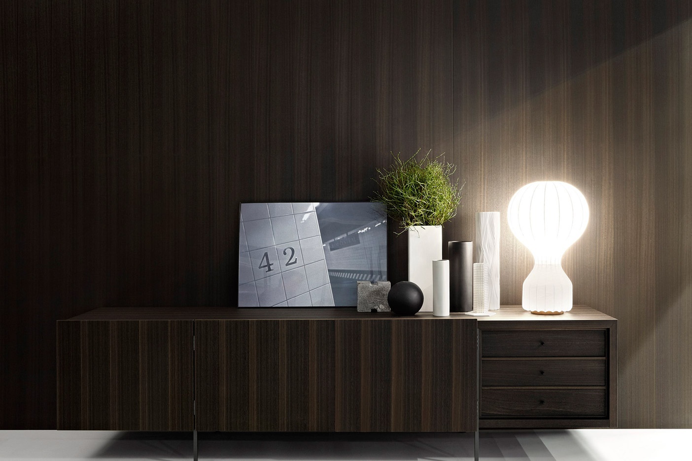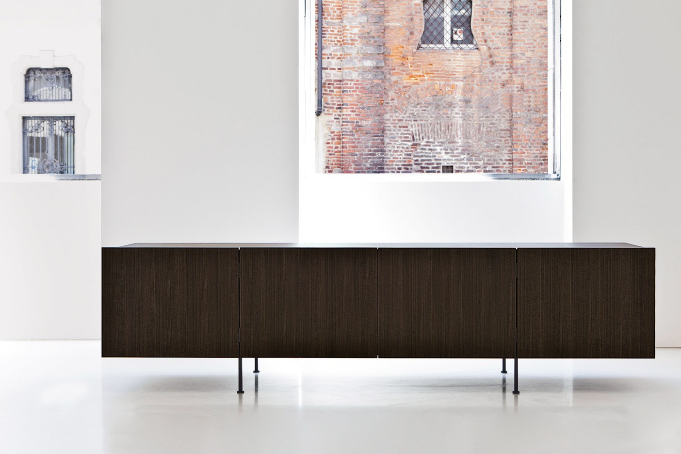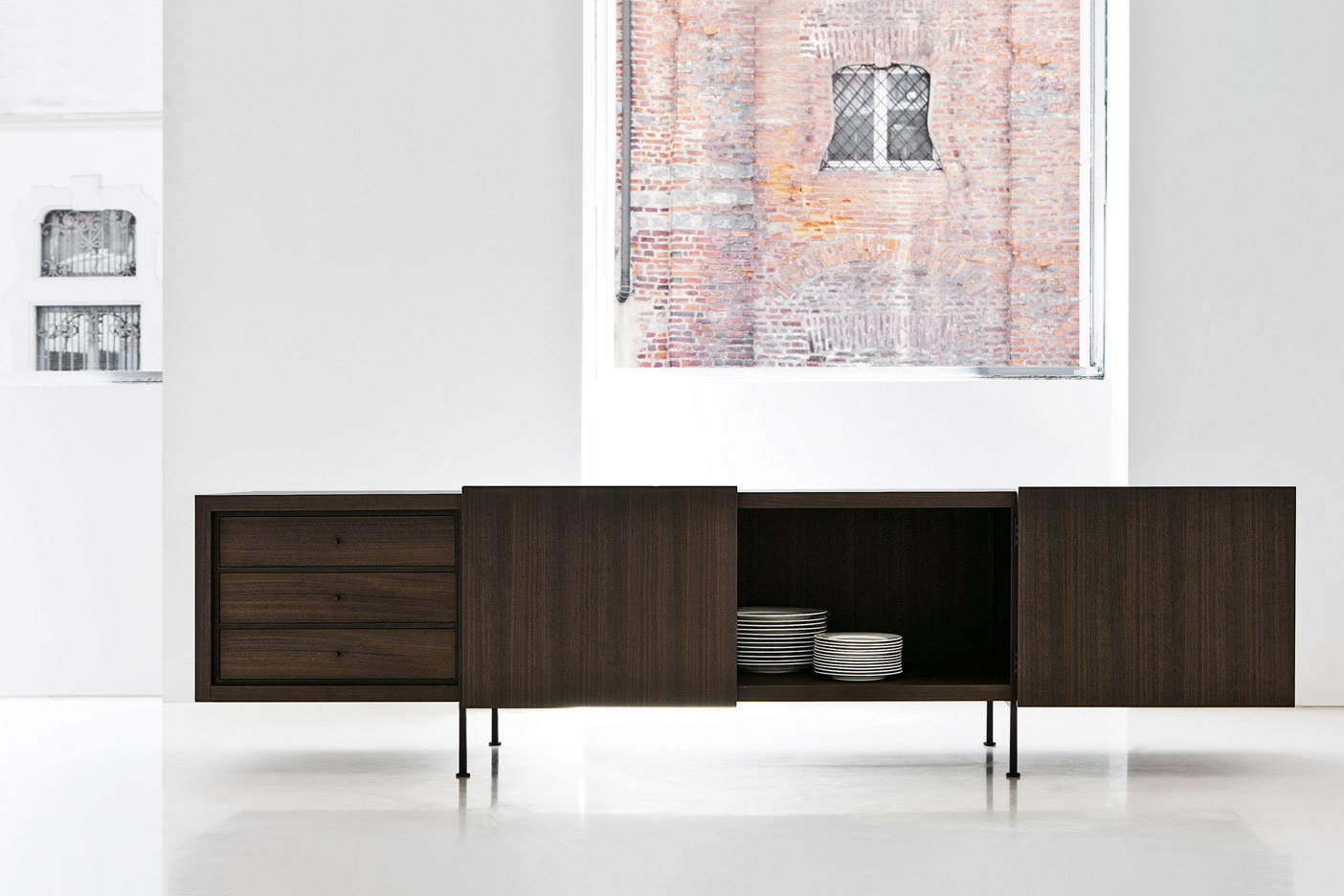 Dresser wooden TILLER from Italian manufacturer Porro. Cupboard made of natural wood with metal legs. Is with double doors, drawers and integrated shelf. Each extends the full length without sagging. Color scheme from the manufacturer.
