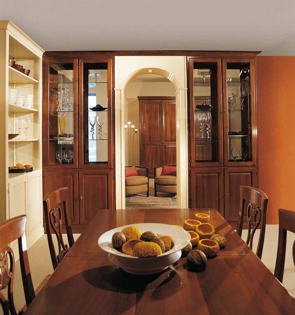 Set for the dining room Palladio from the Italian manufacturer Epocart. Includes a modular system, dining table, chairs and display cases. The buildings models are made of wood. Offers a glossy finish or a matte varnish. Shutters and shelves of glass cabinets. Upholstery textile. Chairs with or without armrests. Set made in a classic style.
