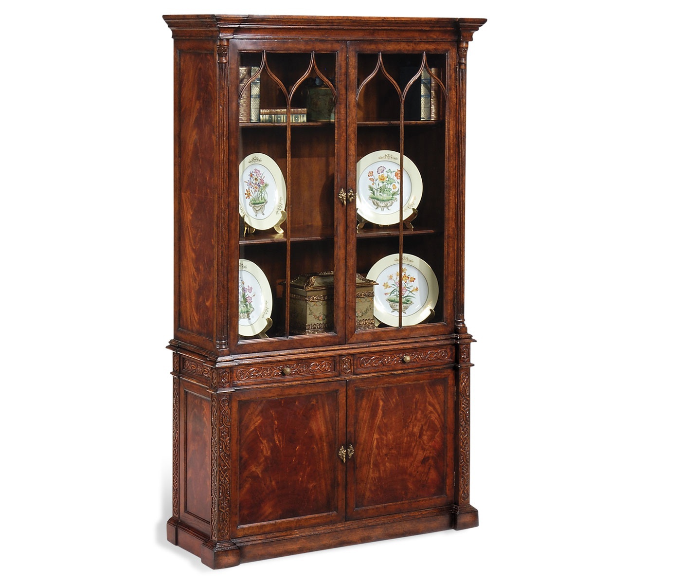 A George III sideboard from the American manufacturer Jonathan Charles. The model is equipped with two drawers and two doors on the bottom and top Cabinet with glass doors and height adjustable shelves. The case is made of natural wood and decorated with carved decoration. Accessories are made of patinated brass.