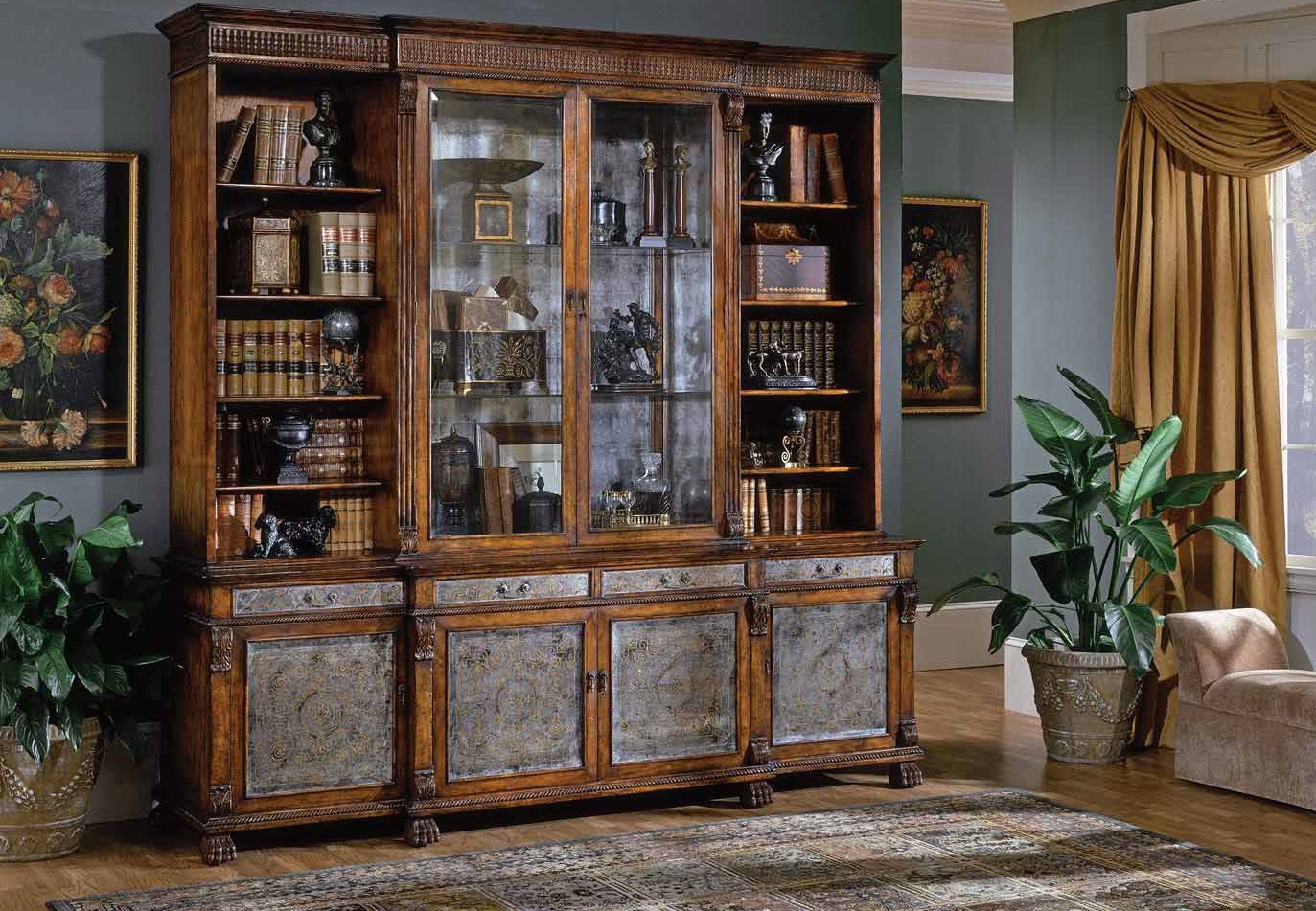 Bookcase Windsor from the American manufacturer Jonathan Charles. The case is made of natural wood and decorated with carvings. Fittings made of brass. The Central part with adjustable glass shelves anteriorly and closed glass doors. On each side are open shelves. The lower part of the Cabinet with four doors decorated with gilt engraving on the glass. The Cabinet rests on legs in the form of lion paws.