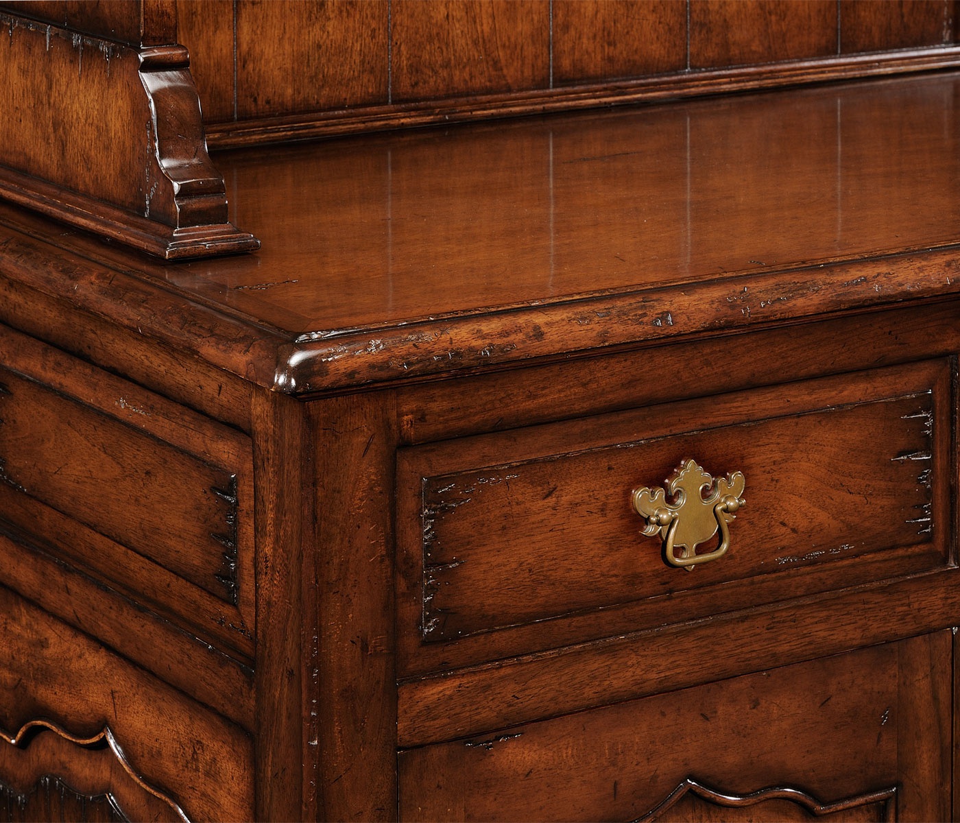 A large buffet Country Farmhouse from the American manufacturer Jonathan Charles. The model is equipped with racks for plates, small drawers for spices and lower Cabinet with four drawers and four doors. The case is made of natural wood and stained walnut. Accessories are made of patinated brass. The design is executed in style of the country.