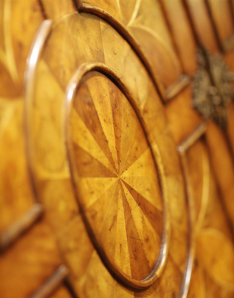 case: wood legs: wood accessories: brass interior trim: engraved glass case: inlay |