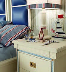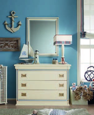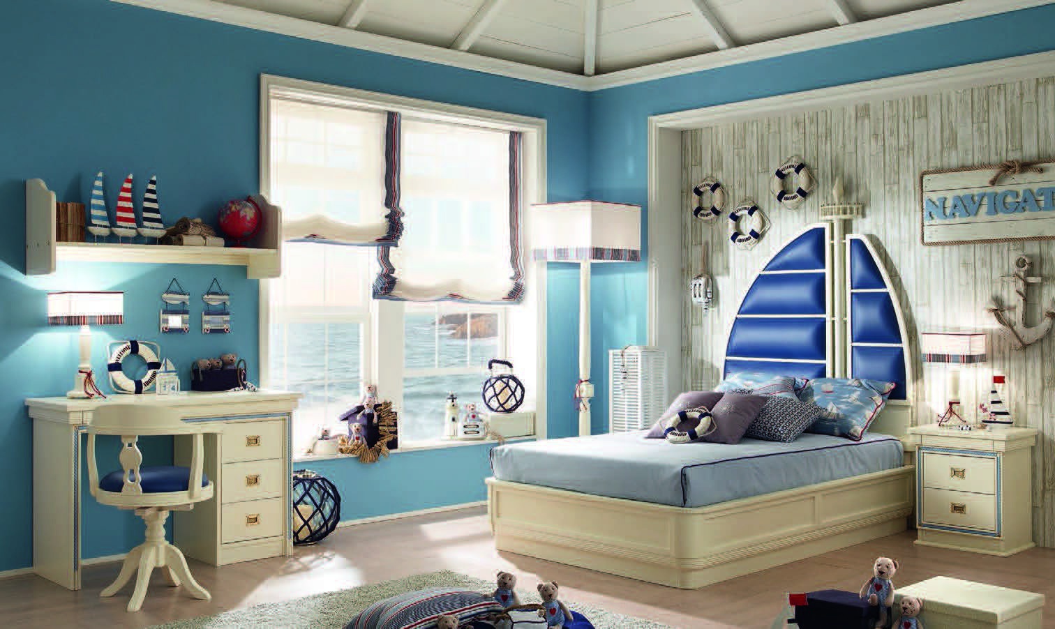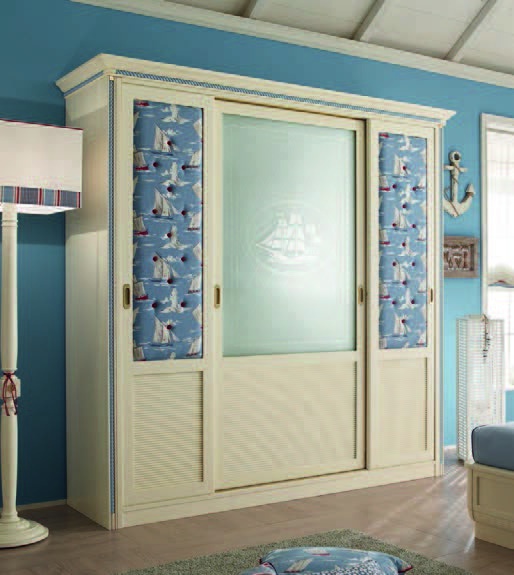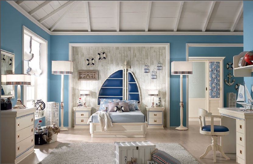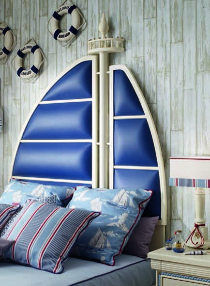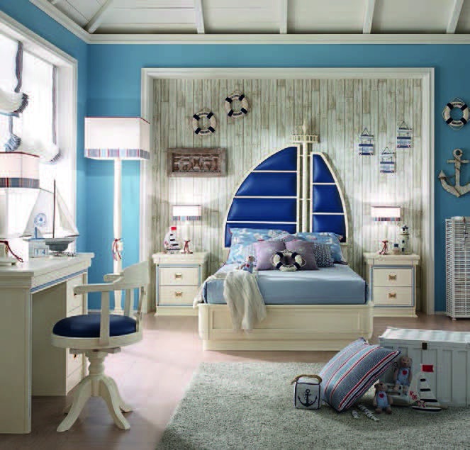 Children (Suite for children) Cordage Italian manufacturer Caroti. Presents set for children's teenage boy bedroom. The presented model of a double bed, bedside tables, bookcase, Desk, chairs, Cabinet. Bed with high headboard in the form of a sail in leather in blue tone. The perfect solution for the nursery in a nautical motif.