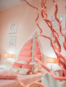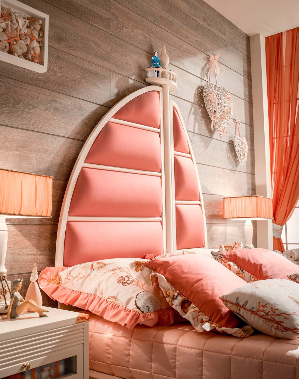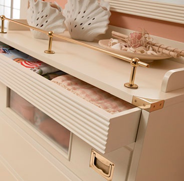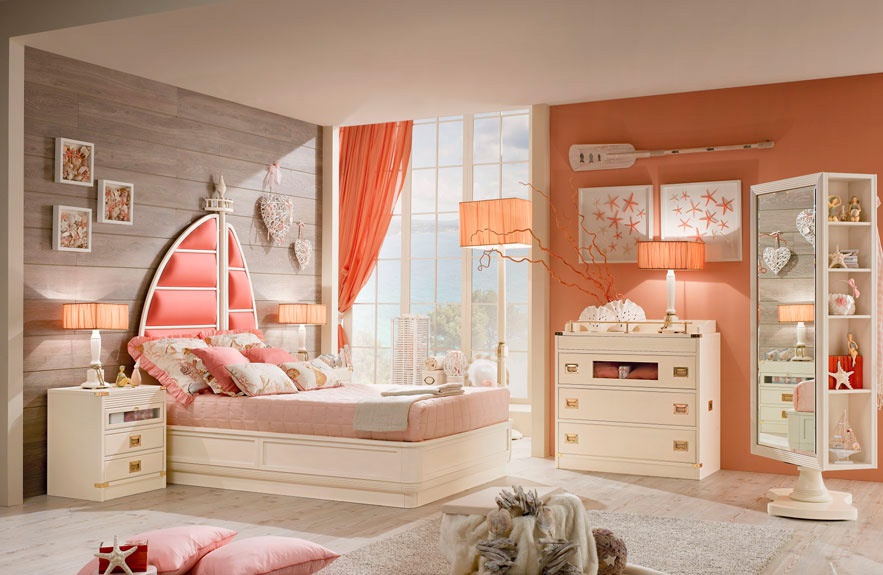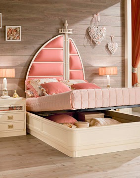 Children (Suite for children) Ariel Italian manufacturer Caroti. The set consists of: chest of drawers, beds, bedside tables, mirror, Cabinet and stool. Color scheme in white and pink tones or to choose from a range of the factory. The headboard is made in the form of a sailboat. Wardrobe with double doors, decorated with textiles in tone pouf. Excellent solution for creating a child's room for girls in a nautical style.