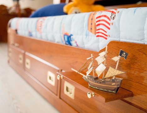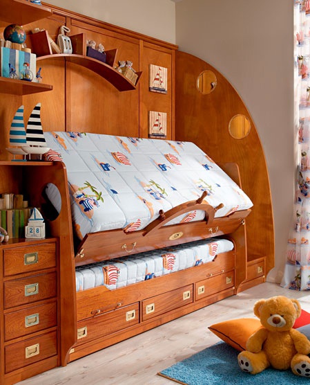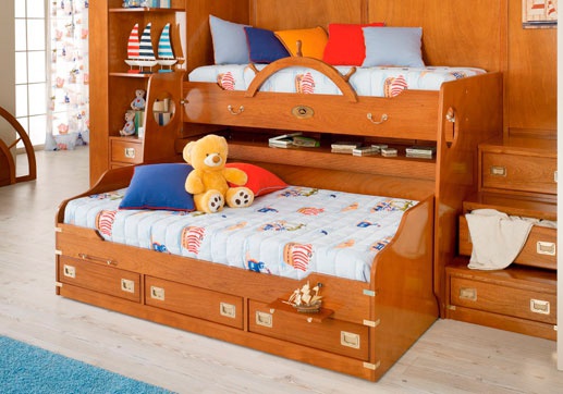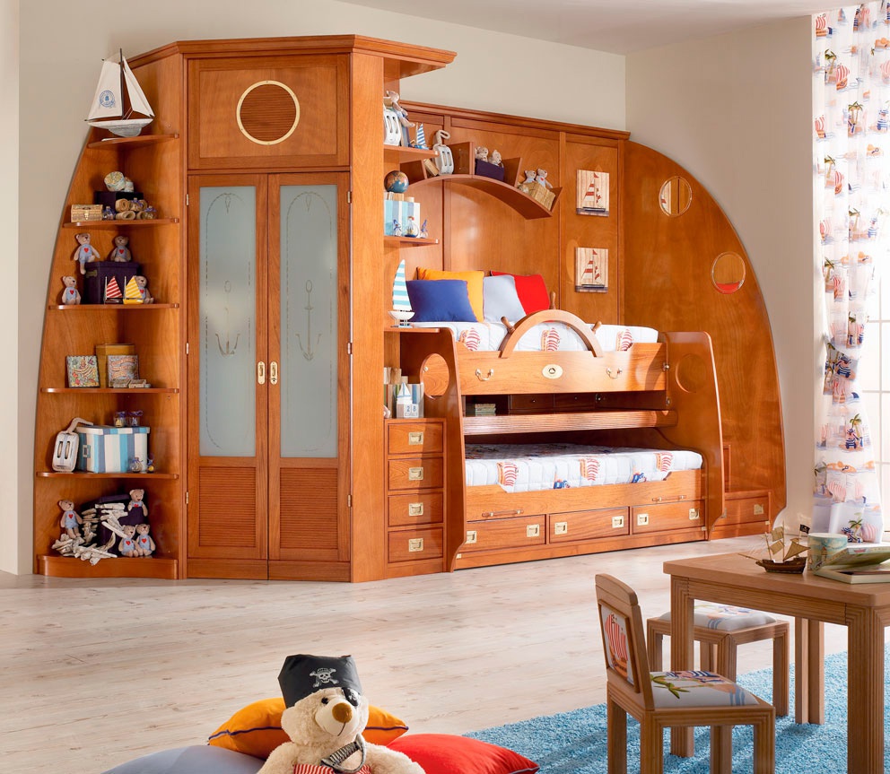 Children (set for children) with bunk bed Maria Vecchia, an Italian manufacturer of Caroti. Presented Suite with bunk beds and with built-in corner Cabinet, pull-out Desk and open shelves. The kit complements the island for games in the shape of a boat with the captain's bridge. The furniture is made from solid natural mahogany or a choice from a range of companies. Great, functional solution for decorating a child's room in a nautical theme.