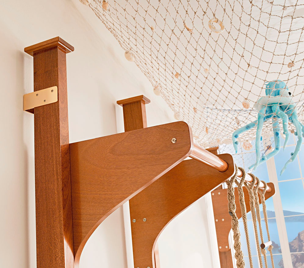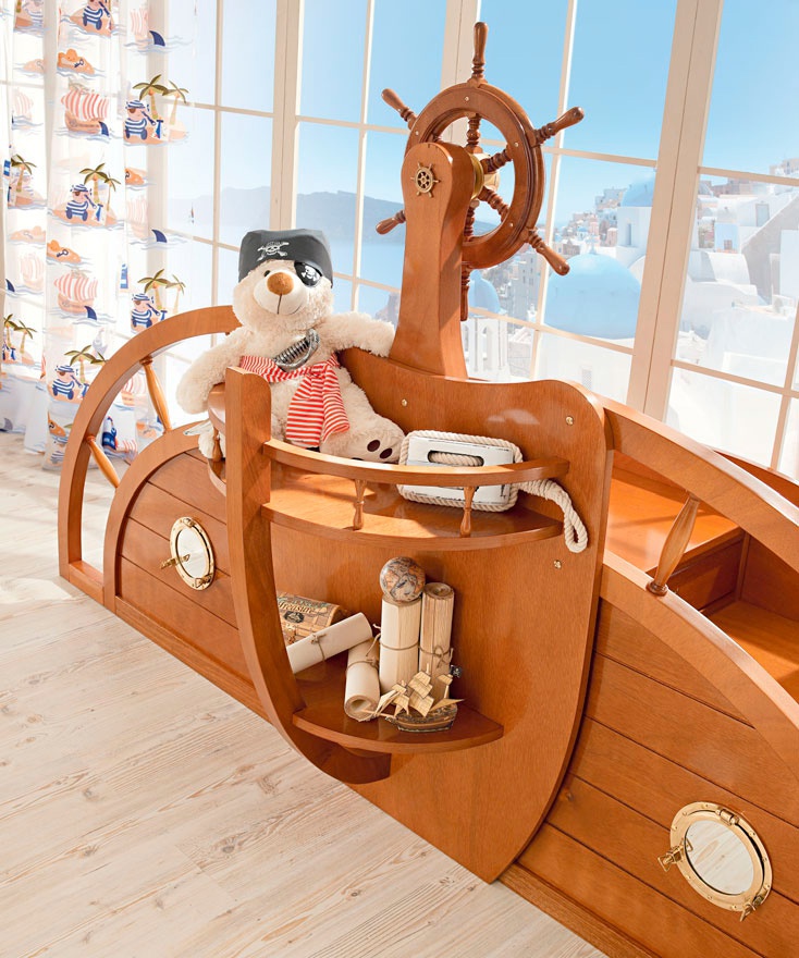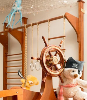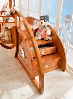 Children's furniture Vecchia Maria from the Italian manufacturer Caroti. The game consists of the island for games in the shape of a boat with the captain's bridge and gym area. The furniture is made of solid wood, decorated with metal inserts. This set will create an atmosphere of fantastic and exciting pirate adventure right in your house.