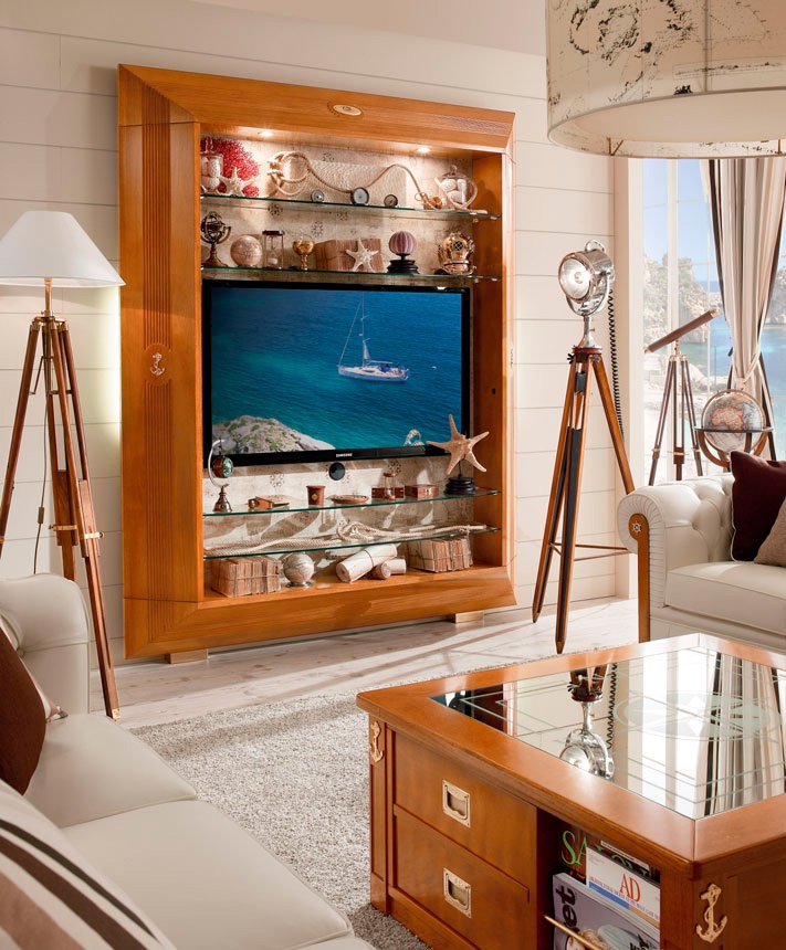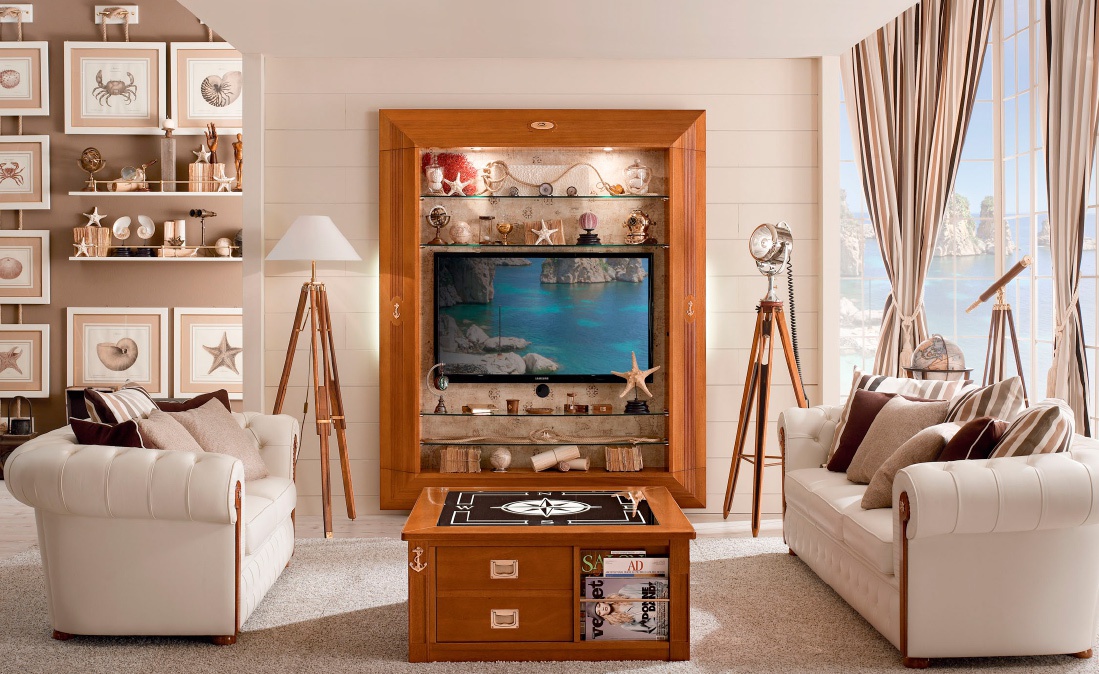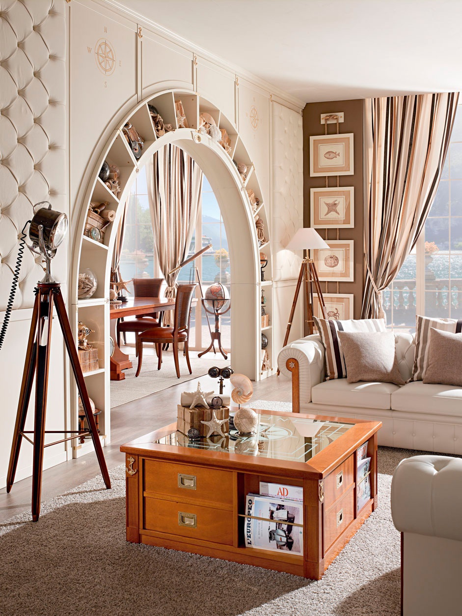 Lounge coffee table, square shape with drawers and open shelves from the Italian manufacturer Caroti. The table top is made of mirror panels, inlaid "compass Rose". The frame of the table is made from solid, natural finish mahogany. Table will perfectly complement modern living room interior in Maritime style.