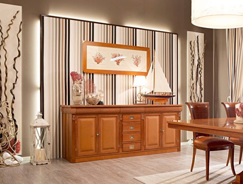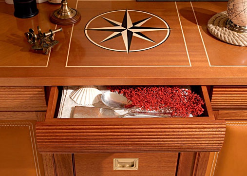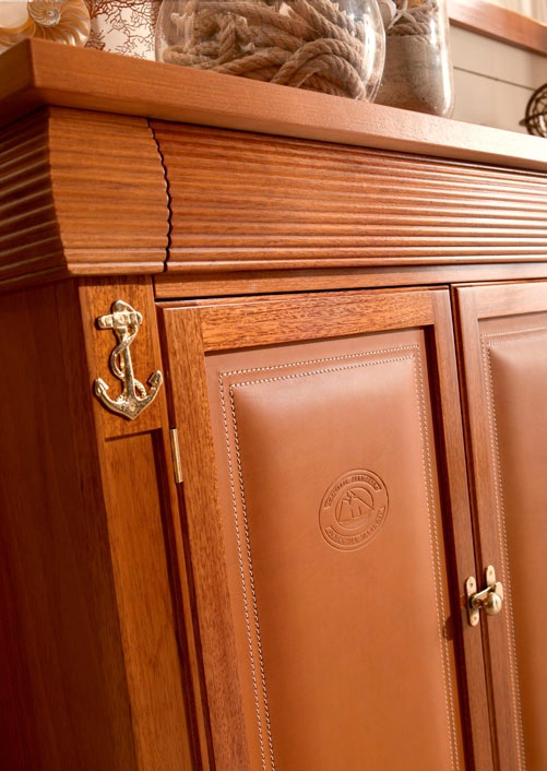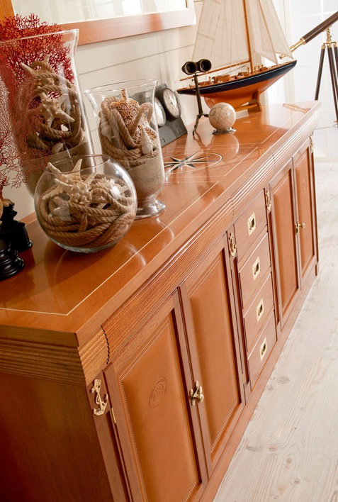 Sestante dresser with drawers and hinged doors Italian manufacturer Caroti. The dresser has a rectangular shape, the frame is made from solid, natural finish mahogany door decorated leather. Colors to choose from a range of companies. A great option for your living room or dining room in a nautical theme.