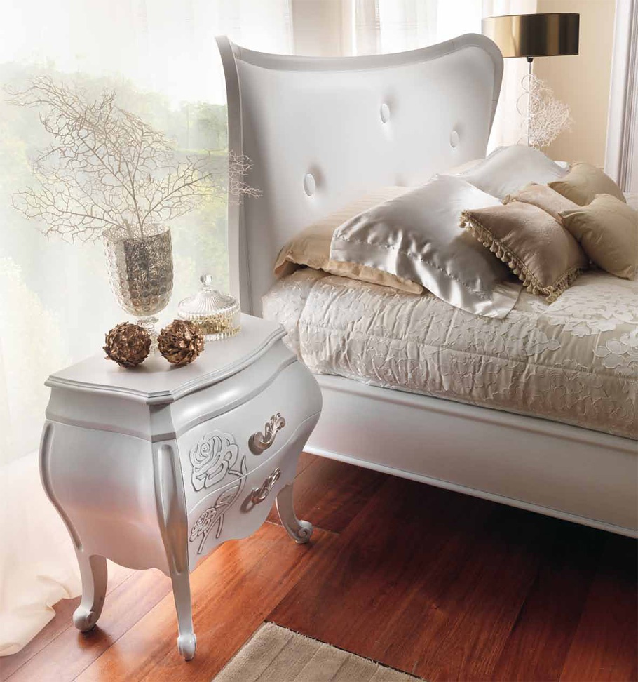 The technical Department of the company Epocart can implement any type of project for different areas of the house. In the process of creation of furniture we use the best woods and finishes. Design philosophy Epocart allows the use of already existing collections, and their individual elements. It is also possible the combination in one project of multiple collections. This photograph presents a double bed and two bedside tables. The frames and legs from wood. Finishes are lacquered white. The headboard is covered in a skin of white. Drawers bedside tables complemented with metal handles.