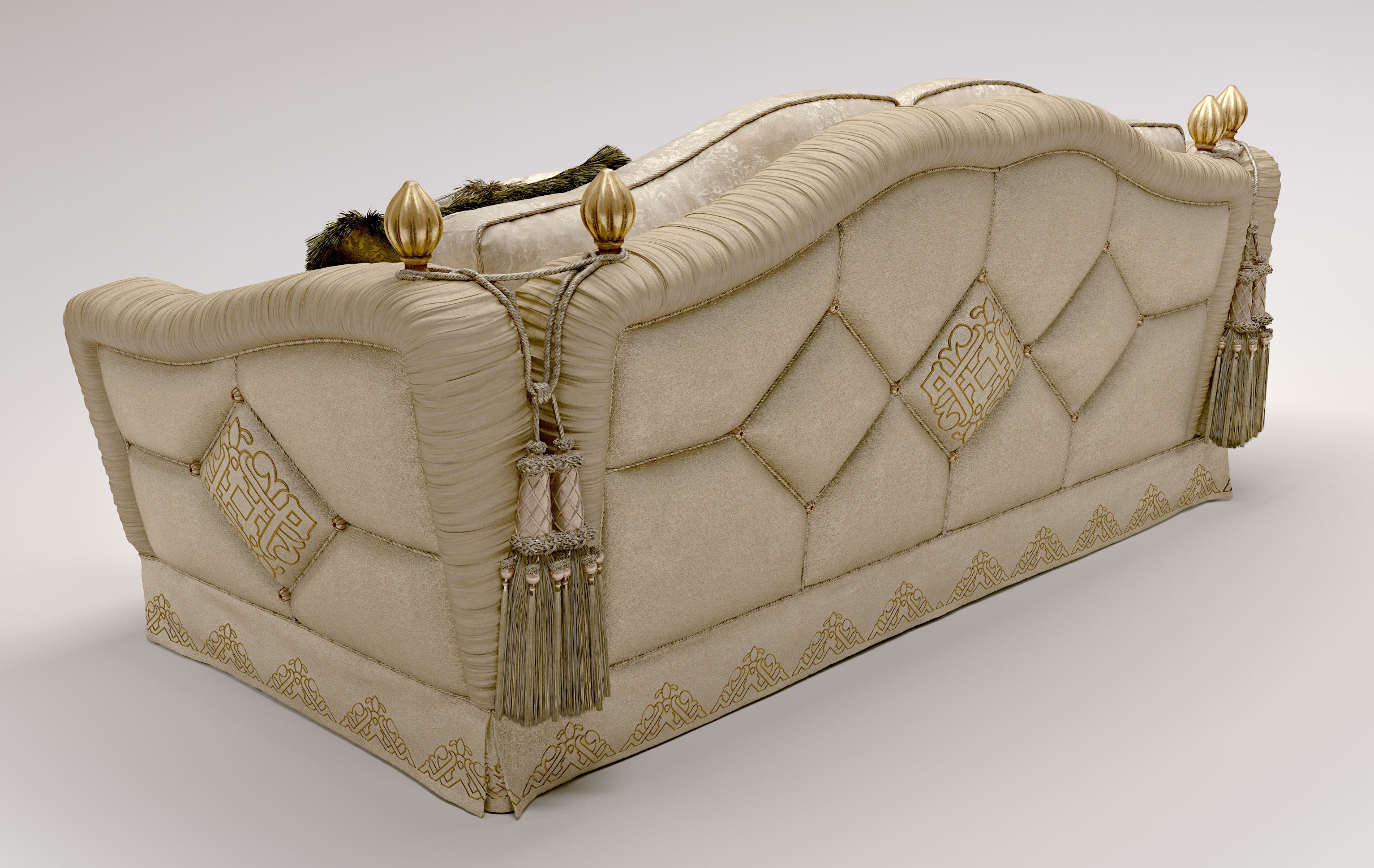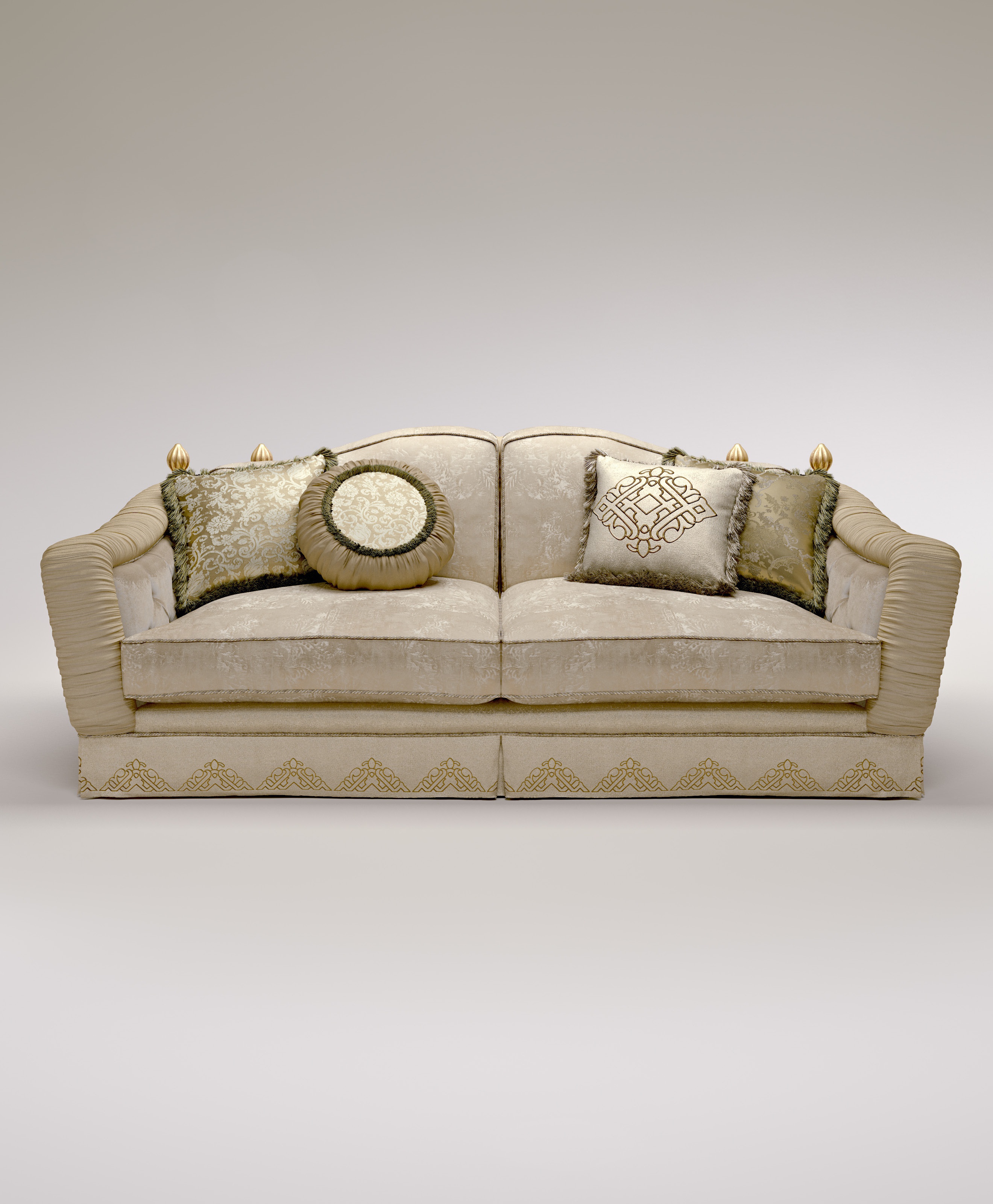 | Description: | Achille sofa from Italian manufacturer Bruno Zampa. Model with a hidden frame. Functional sofa with the folding mechanism. Frame of solid wood. Upholstery embroidered textiles from the company portfolio. Seat and back cushion with natural feather and polyurethane insert. Finish as in the photo. |