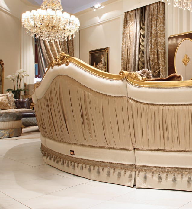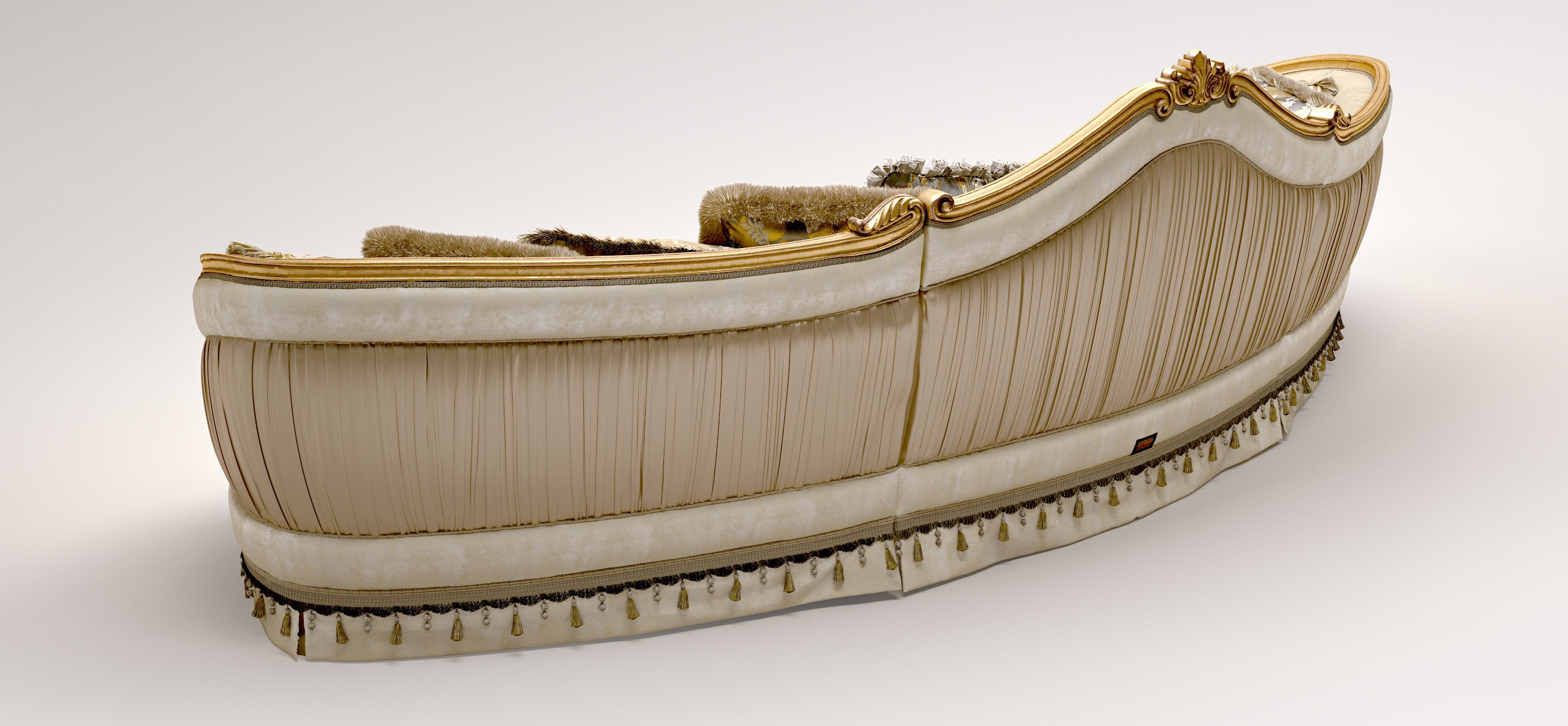 Dorian semi-circular sofa from Italian manufacturer Bruno Zampa. Keeping sophistication and great taste of the past, this model will allow You to enjoy all the benefits of the modern world. Frame of solid wood decorated with hand carved and gilt surround. The seat is formed by three large pillows with extra volume, trimmed along the contour fringe. The underside of a couch covered with a drop skirt with tassels. A semi-circular backrest with oval armrests in the center is decorated with carved gilt phial. The inner part of the backrest is decorated with stitch Capito, the outer part is elegantly draped with stripgame. Textile upholstery plain and floral patterns, a filler - polyurethane foam of different densities and feather. Final accents will put the extra set of pillows of different shapes and designs.