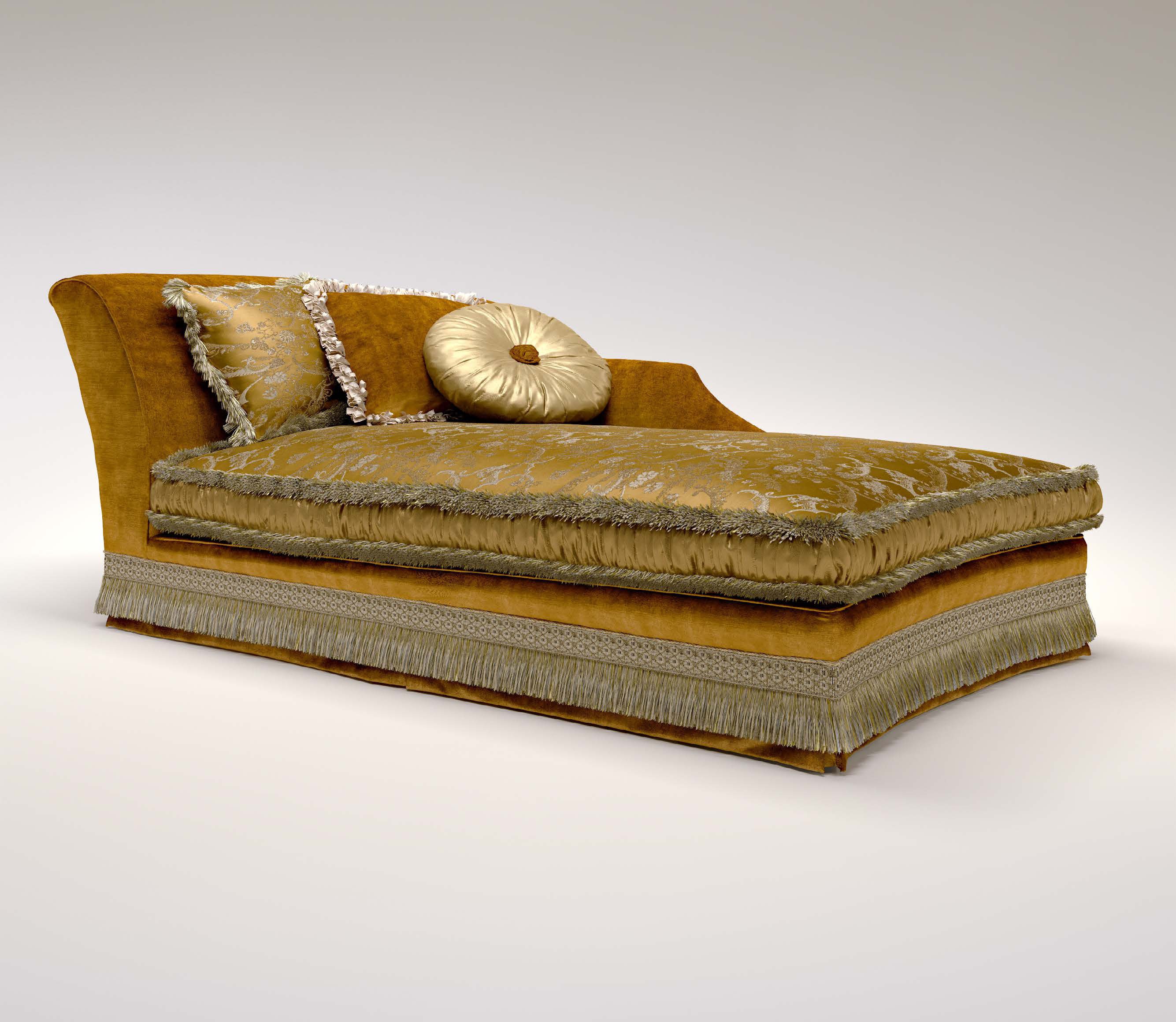 Emily couch from the Italian manufacturer Bruno Zampa. The model with the folding mechanism. Frame made of natural wood. Upholstery textile from the company portfolio. The outer part is decorated with vertical folds and button closure, fringe applique on the skirt. Back cushions: down and polyurethane. Colours in stock.