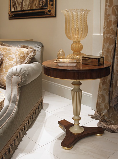 Round coffee table Otello from the Italian manufacturer Bruno Zampa. The model is made from solid wood, hand carved. The finishing - varnish. The table top is decorated with inlay. Decorative elements - gilding. Colours in stock.