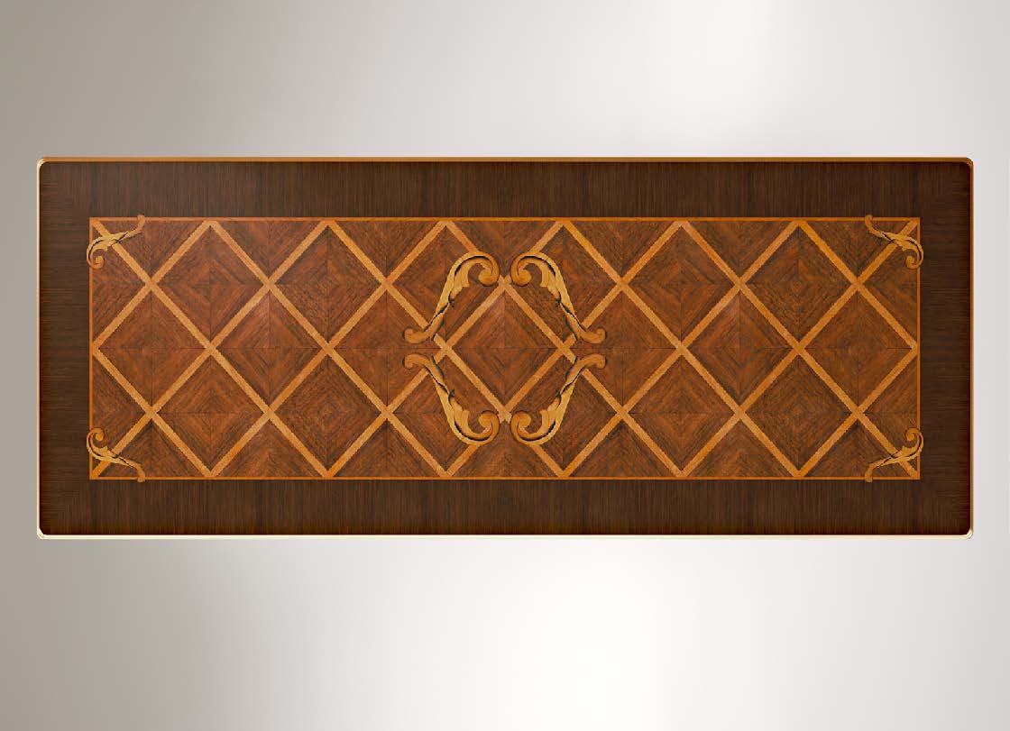 Elliot dining table by Italian manufacturer Bruno Zampa. The model is made from solid wood. Legs are carved, handmade. The table top is decorated with inlay. Colours in stock.