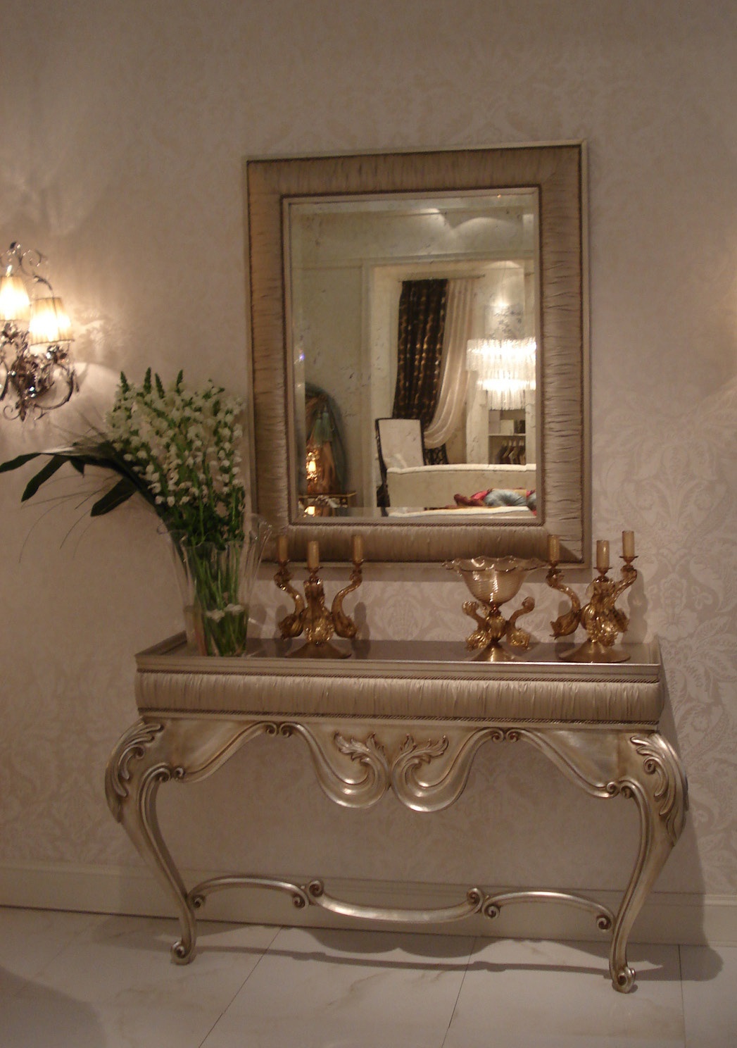 Console Passepartout from the Italian manufacturer Bruno Zampa. The model is made from solid wood. Legs are decorated with hand-carved. Marble top available table top made of glass or wood. Finishing - gilding, varnish. Colours in stock.