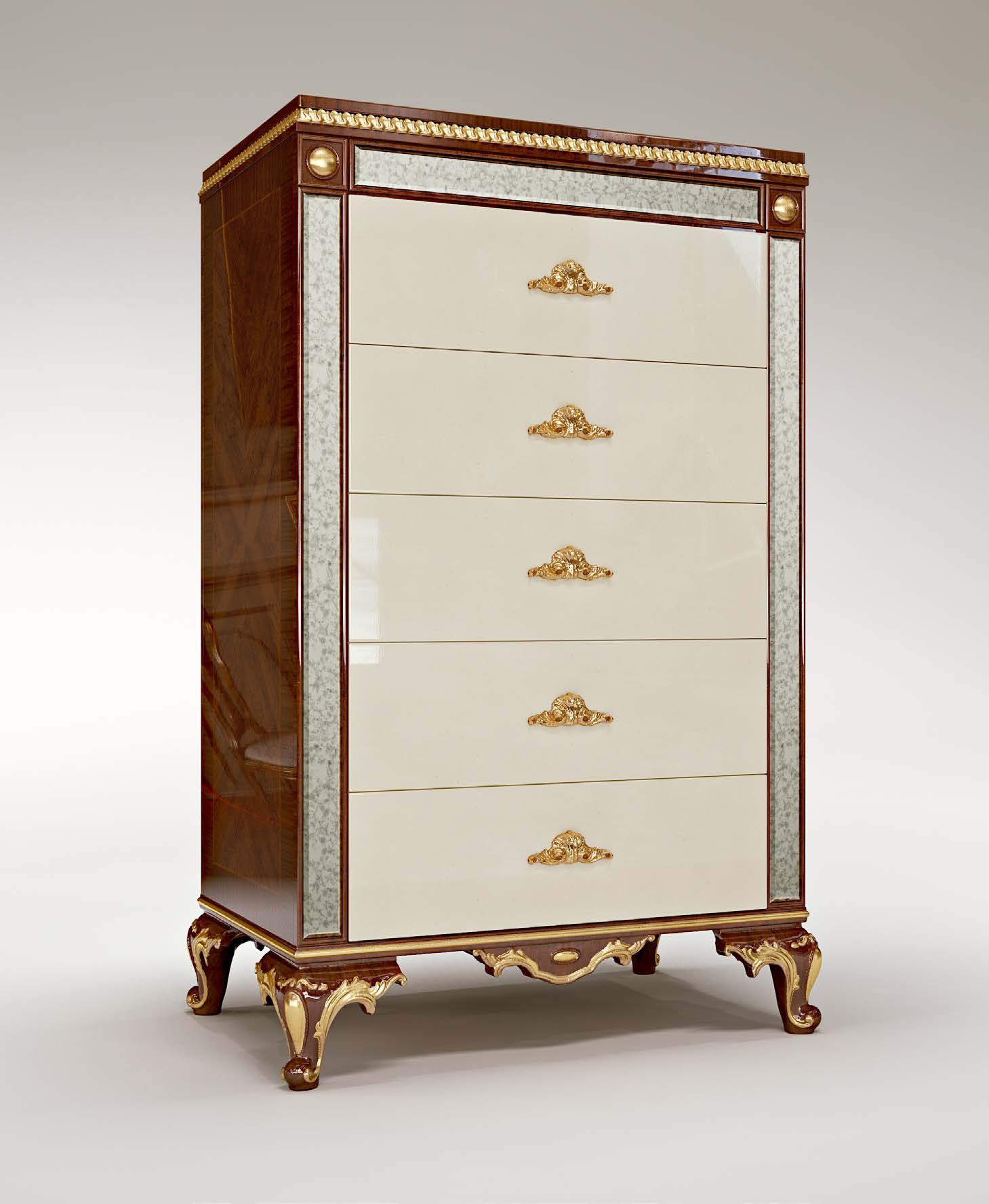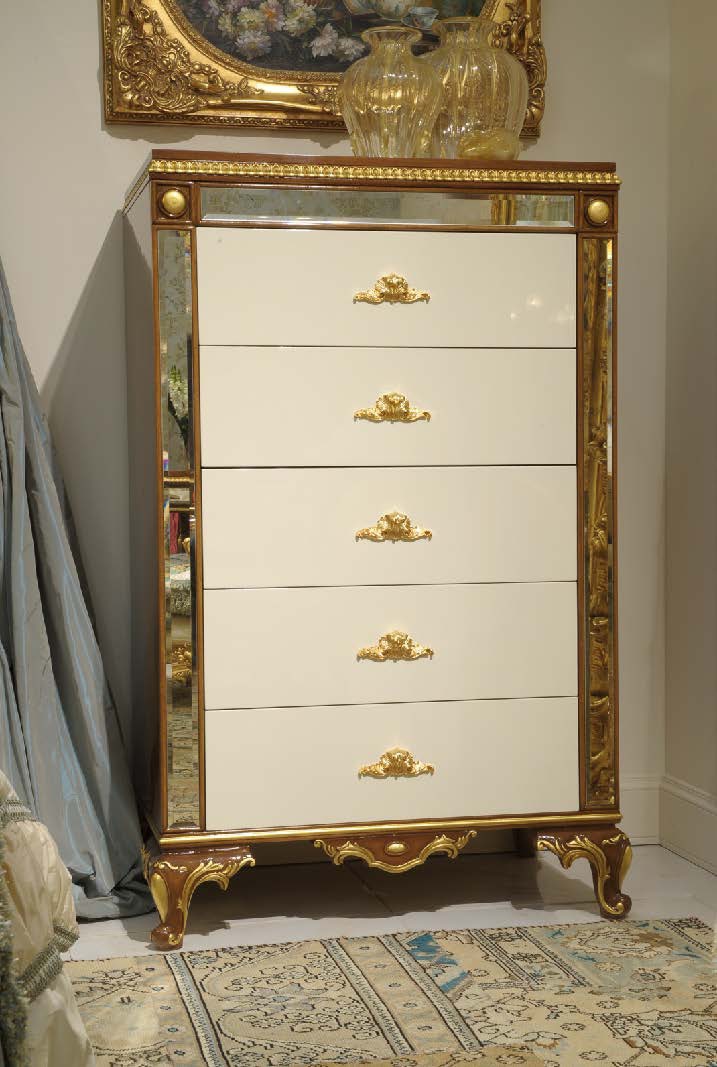 Dresser with drawers from Alexander Italian manufacturer Bruno Zampa. The model is made from solid wood. Legs are decorated with hand-carved. Finish - lacquer, gilding. Decorative elements: mirror glass “Antica Venezia” on the sides, inlaid. Handles from brass alloy.