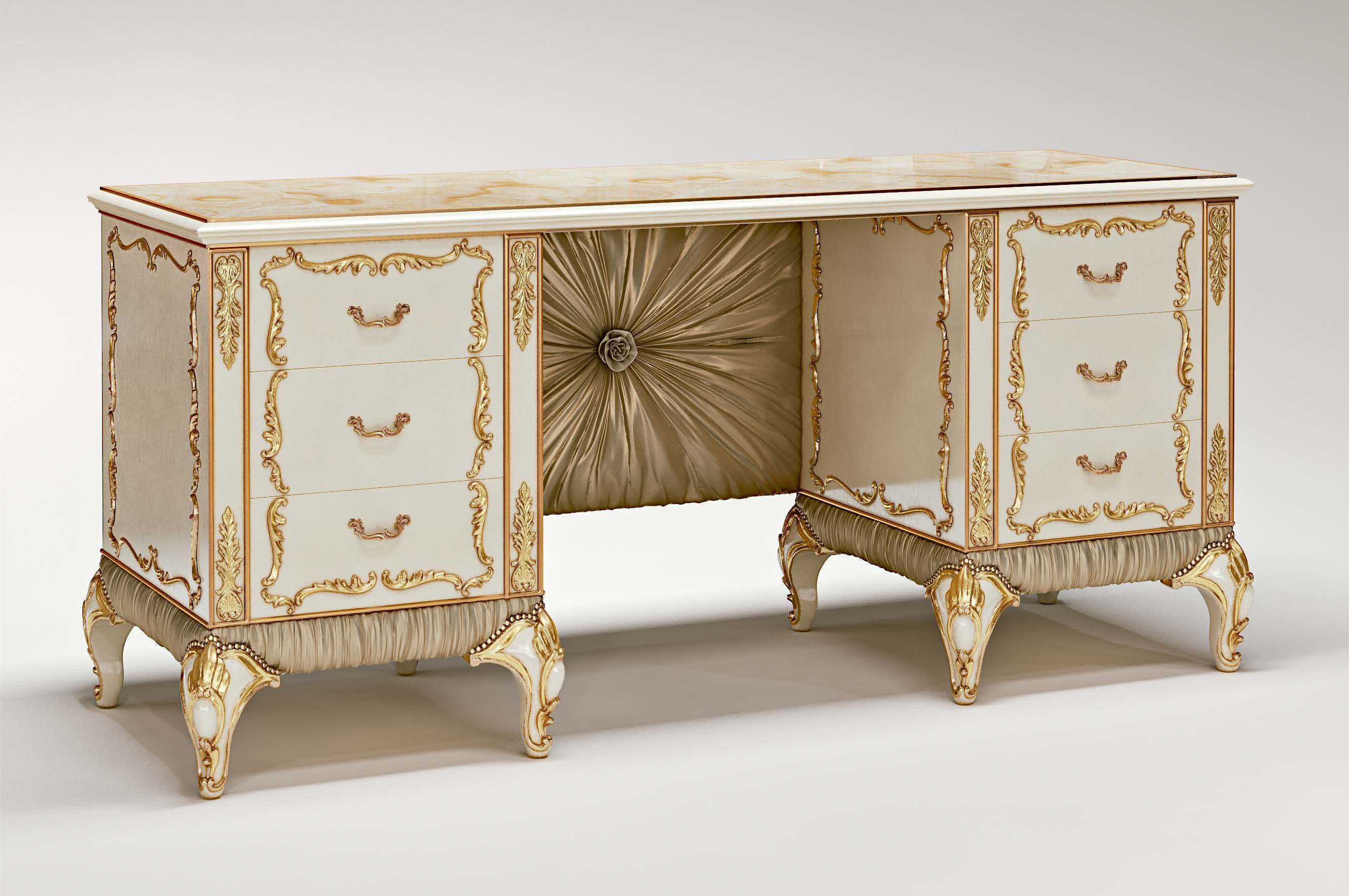 Cecilia dressing table from the Italian manufacturer Bruno Zampa. The model is made from solid wood. Legs are decorated with hand-carved. Top of marble. Finish - lacquer, gilding. Decorative items: textiles. Handles from brass alloy.