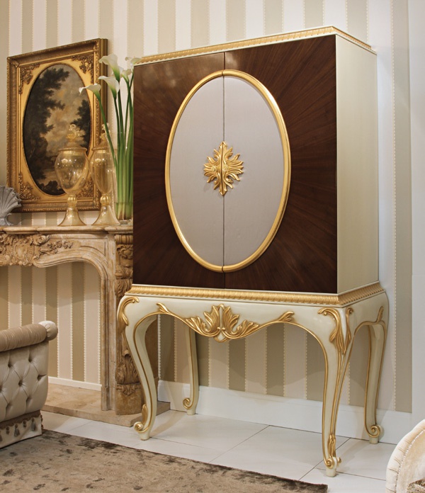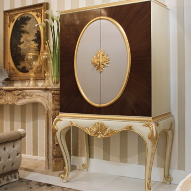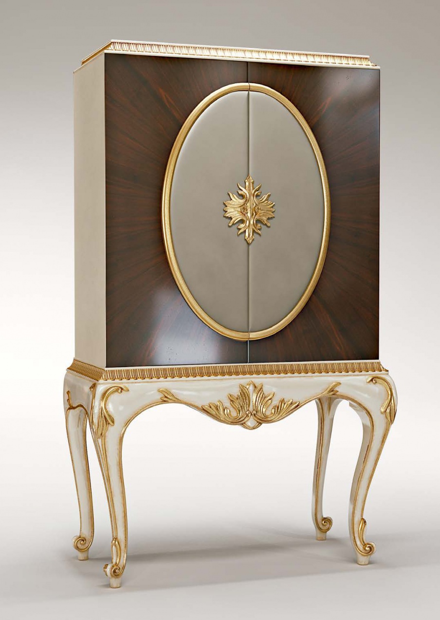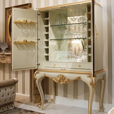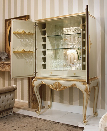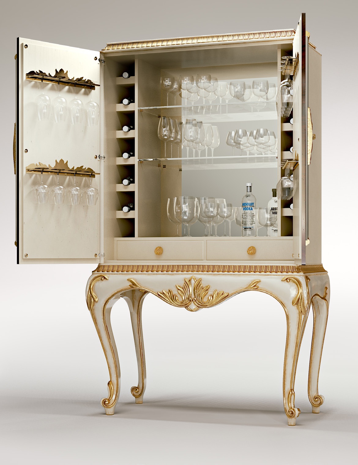 Bar Cabinet Dorian from the Italian manufacturer Bruno Zampa. The model is made from solid wood. Legs are decorated with hand-carved. Finish - lacquer, gilding. Glass shelves. Handle and stand for bottles made from the alloy brass. Colours in stock.