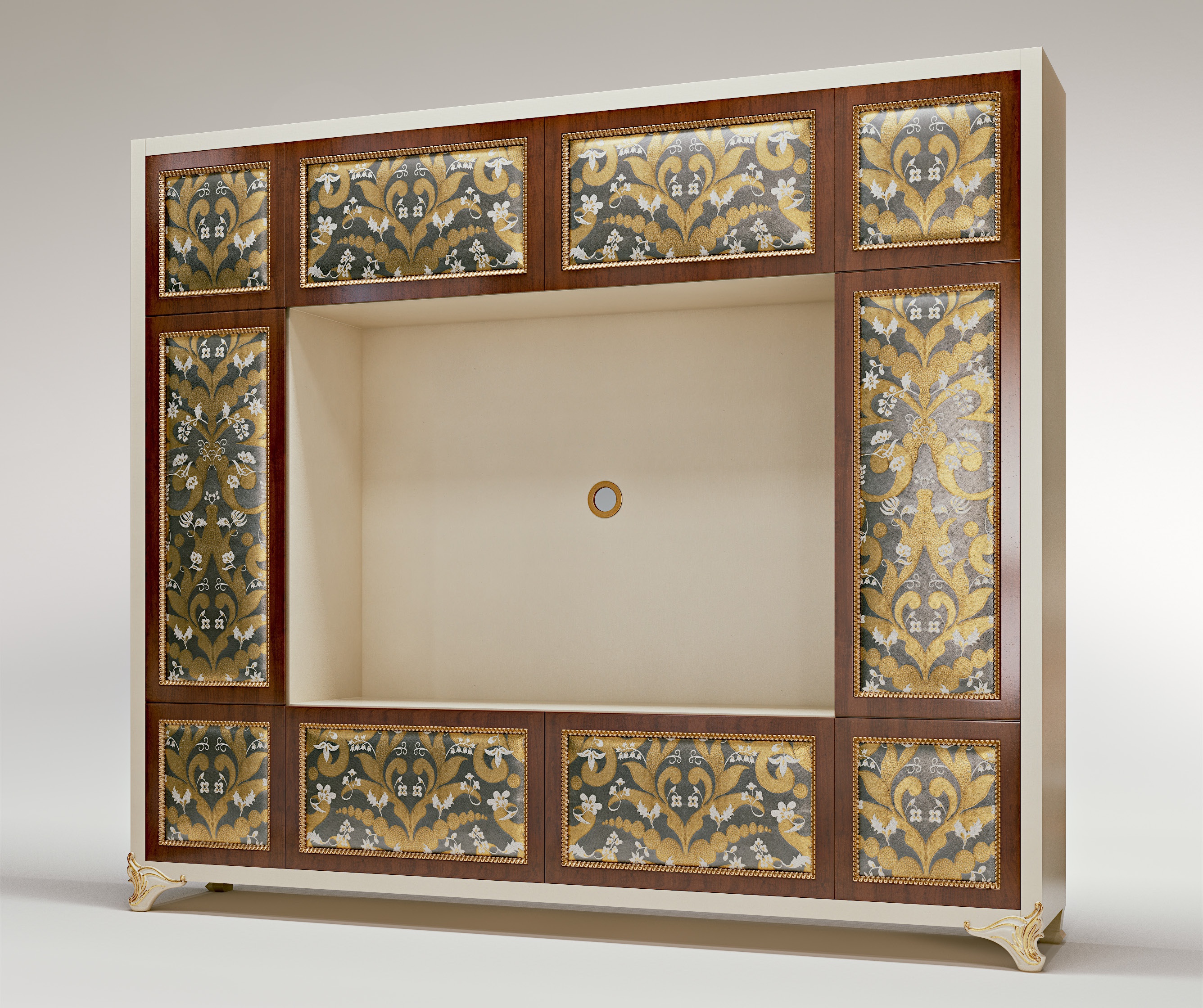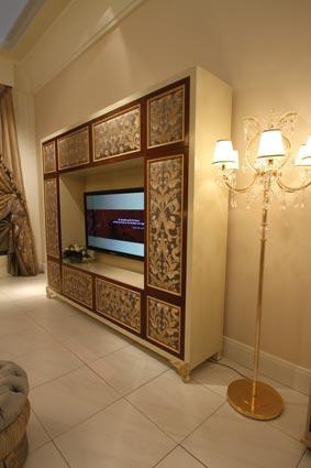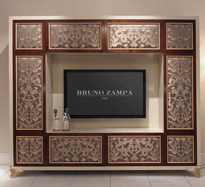 Cabinet for TV Elliot tv unit from Italian manufacturer Bruno Zampa. The model is made from solid wood. Carved handmade. Finish - lacquer, gilding. Doors with inserts of fabric. Handles from brass alloy. Colours in stock.