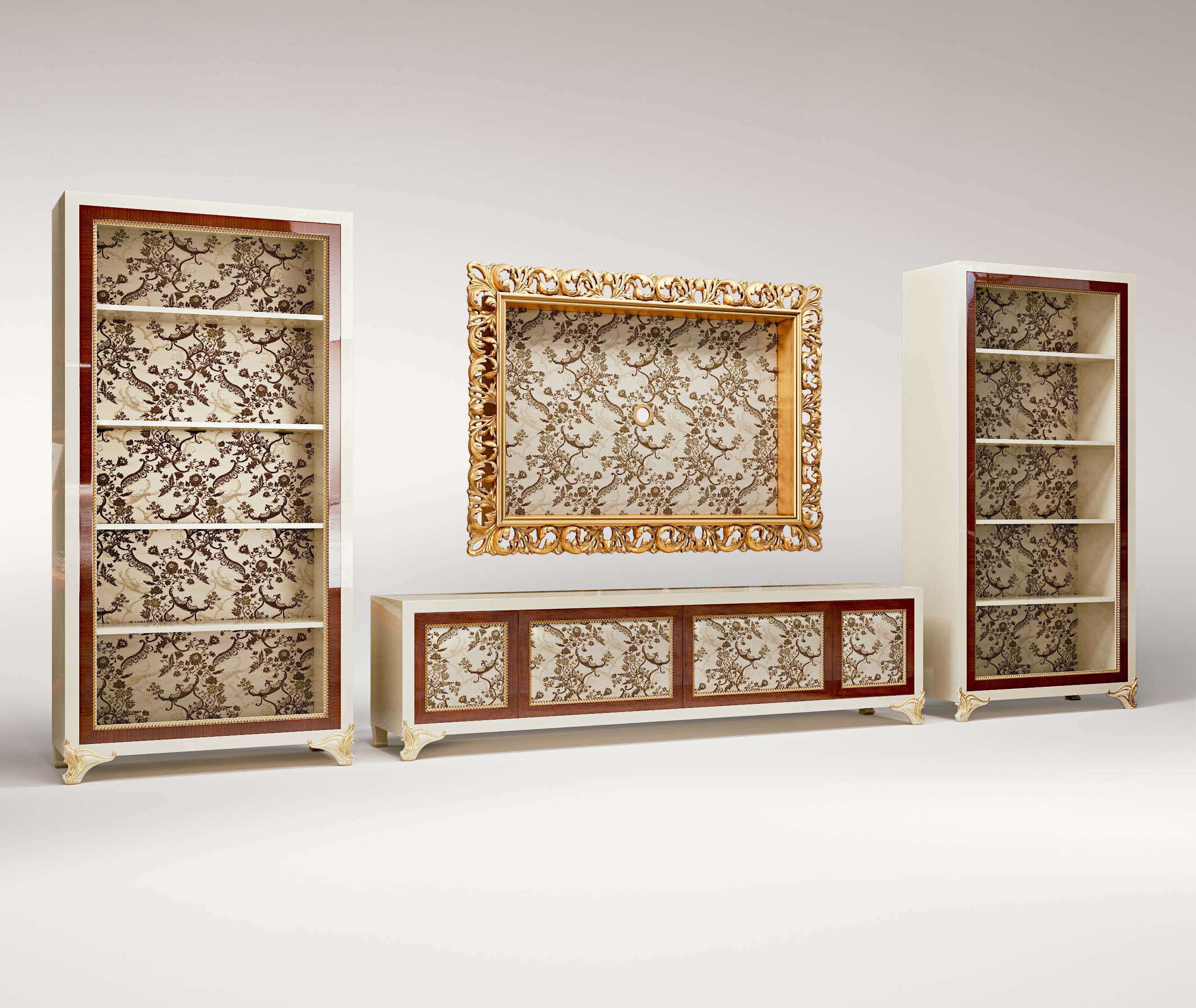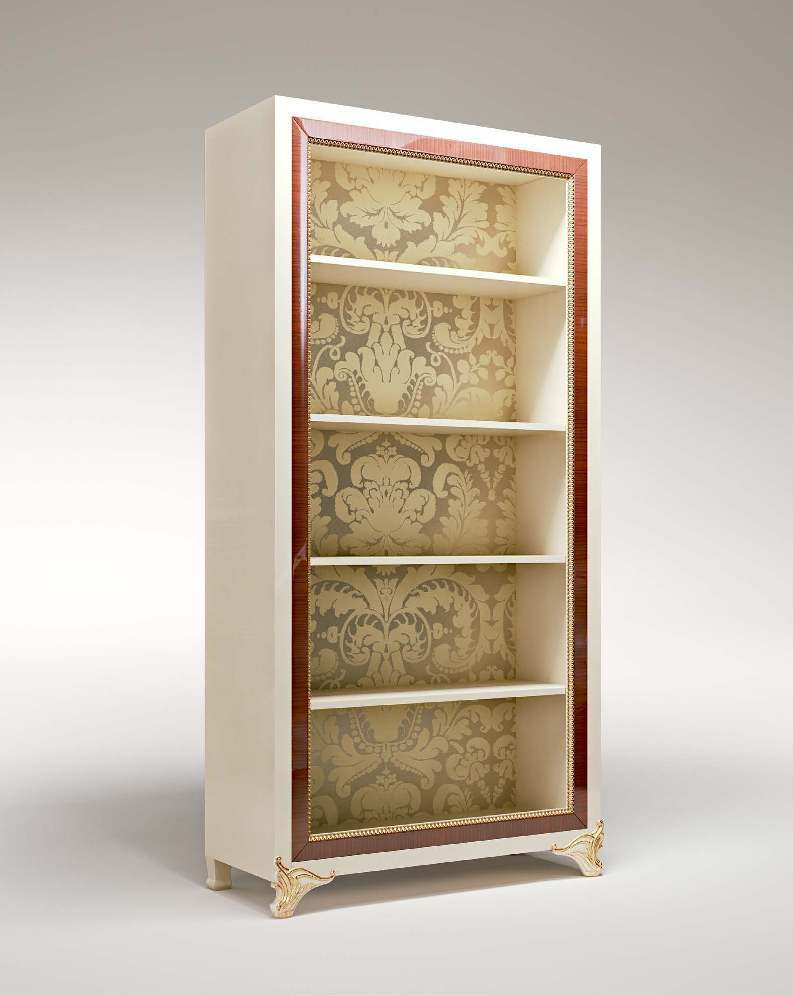 Bookcase Elliot from the Italian manufacturer Bruno Zampa. The model is made from solid wood. Legs are decorated with hand-carved. Finish - lacquer, gilding. Rear panel of fabric. Handles from brass alloy. Colours in stock.