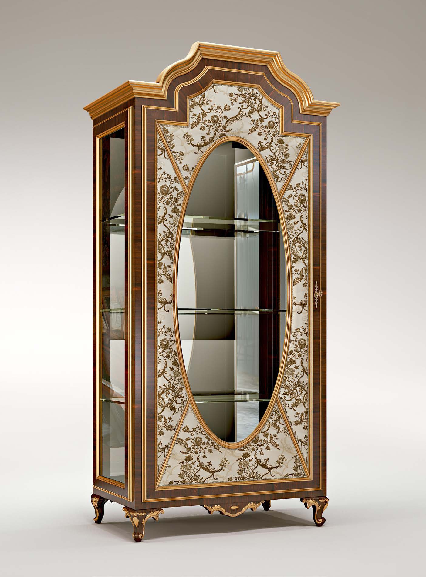 case: solid wood handles: brass shelves: mirror glass the facade: textiles decorative elementi: carved |