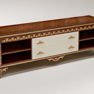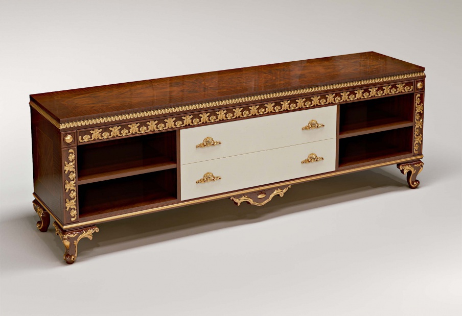 Cabinet for TV Cameron from the Italian manufacturer Bruno Zampa. The model is made from solid wood. Legs are decorated with hand-carved. Finish - lacquer, gilding. Handles from brass alloy. Colours in stock.