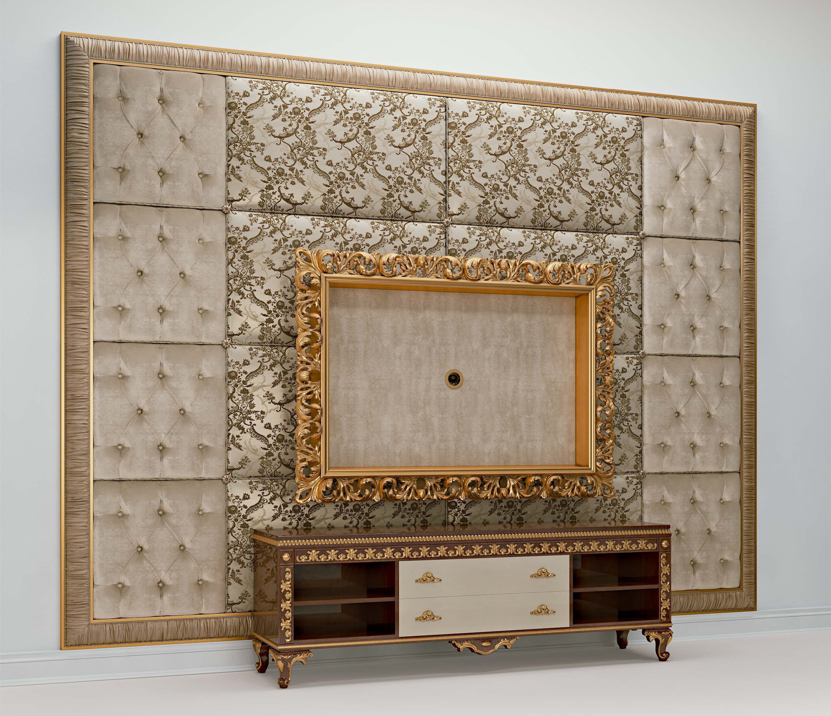 Modular system for TV Passepartout from the Italian manufacturer Bruno Zampa. The model is made from solid wood. Carved handmade. Finish - lacquer, gilding. Handles from brass alloy. Colours in stock.