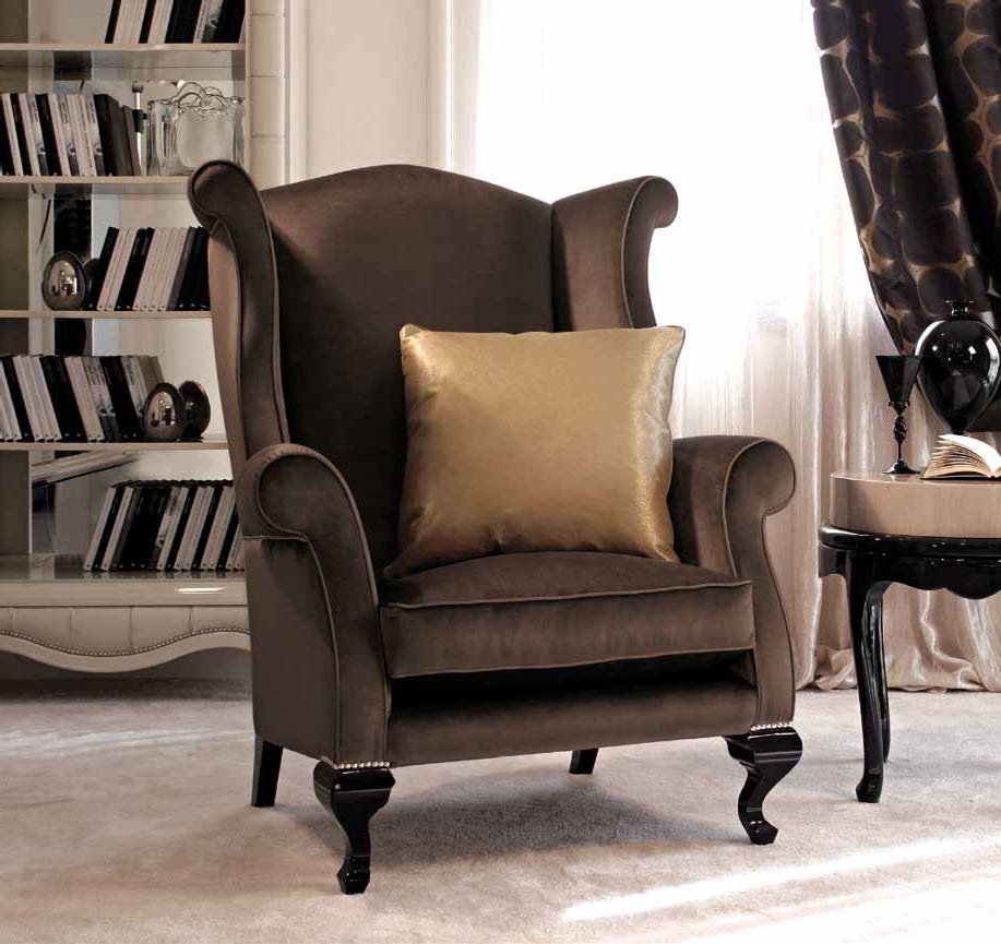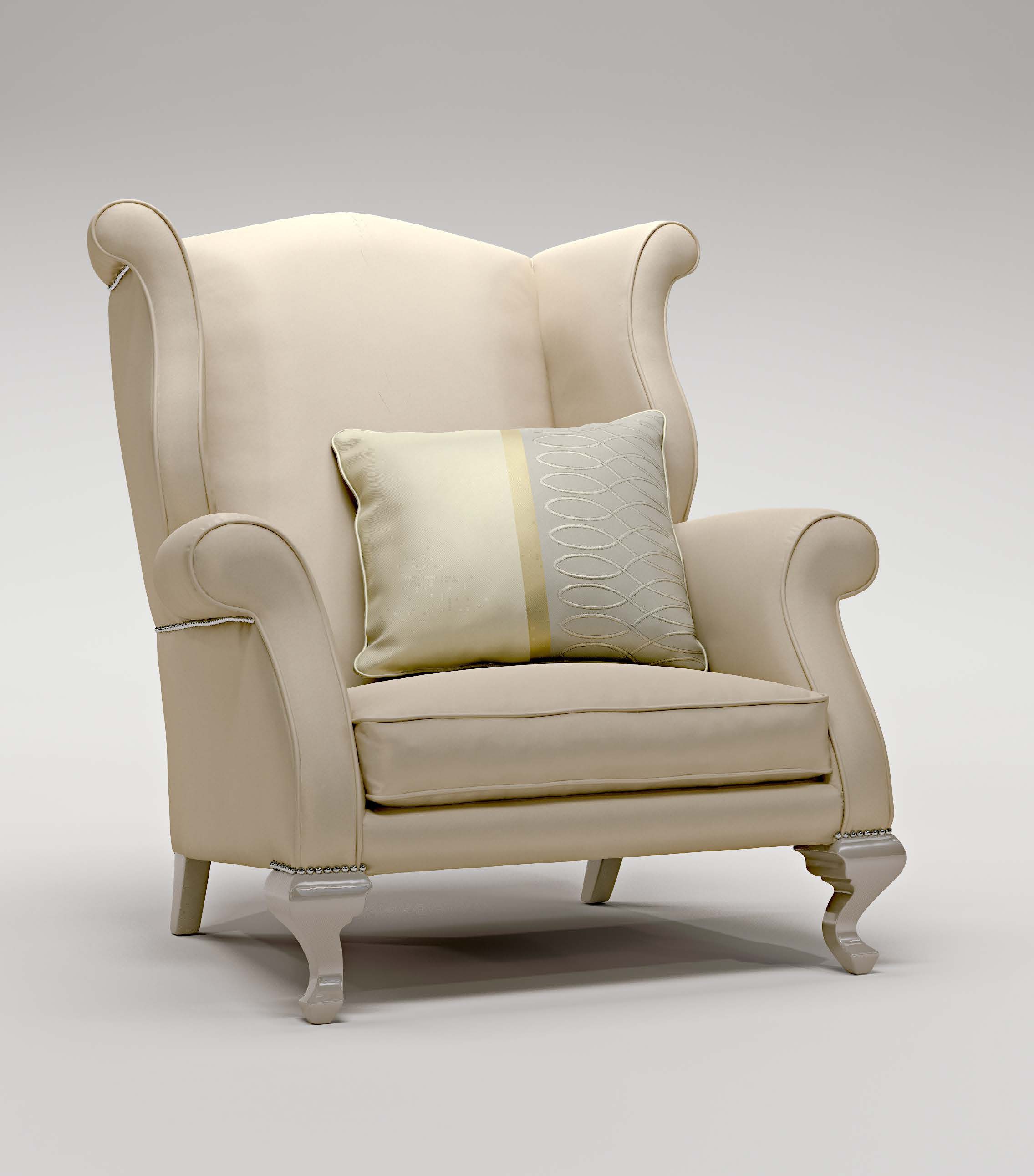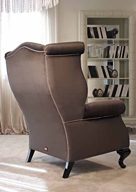 The Diva chair from the Italian manufacturer Bruno Zampa. The frame is made from solid wood. Legs in silver-plated finish. Upholstery textile from the assortment, is decorated with furniture nails. Filler: down and insert in polyurethane. Colours in stock.