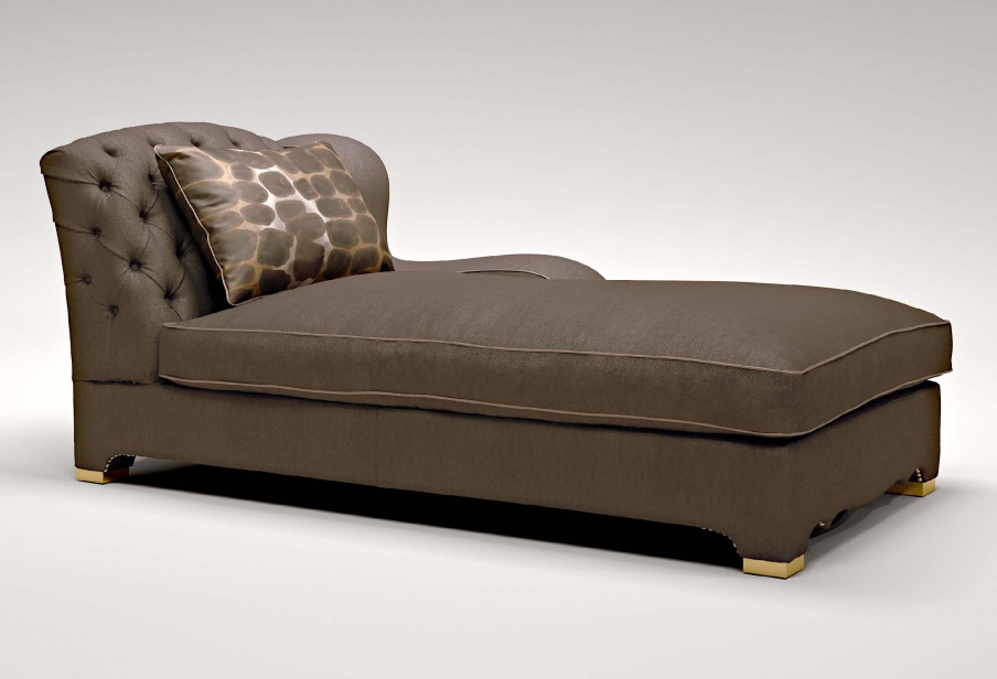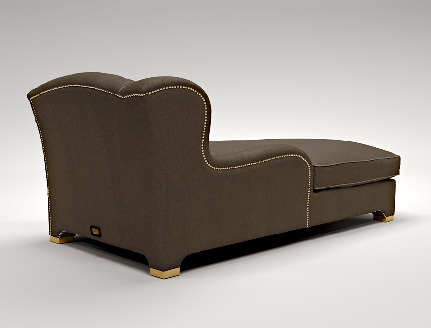 Chaise Ego from the Italian manufacturer Bruno Zampa. The frame is made from solid wood. Upholstery textile from the assortment, is decorated with furniture nails. Fluff filler and polyurethane. Colours in stock.