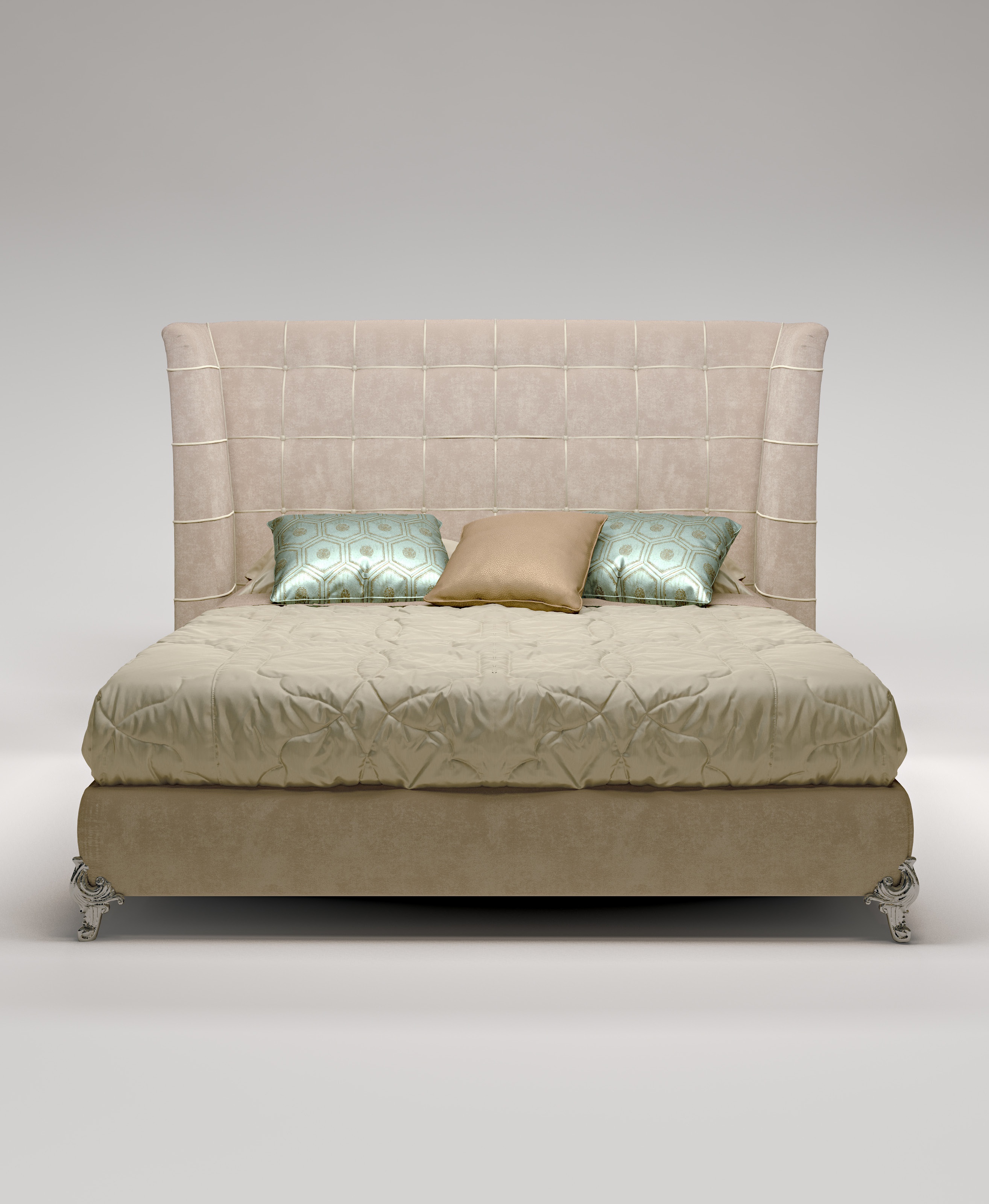 Double bed with upholstered headboard King from the Italian manufacturer Bruno Zampa, the Avantgarde collection. Frame of solid wood, headboard and legs are decorated with hand-carved - headboard Capito. The frame is in a soft upholstery. Upholstery textile from the company portfolio.