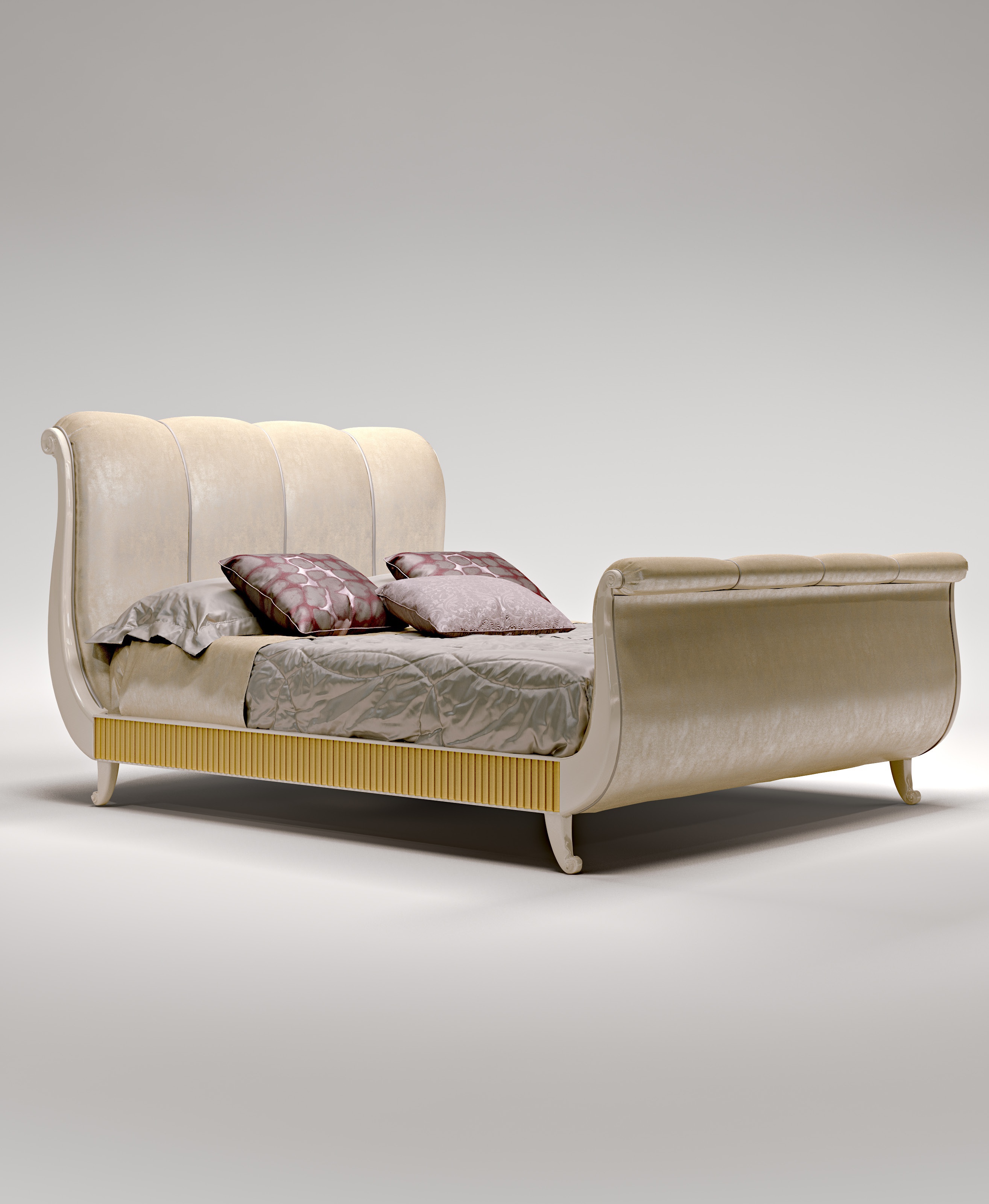 Double bed with upholstered headboard Turandot by Italian manufacturer Bruno Zampa, the Avantgarde collection. Frame of solid wood, headboard and legs are decorated with hand-carved. Upholstery textile from the company portfolio. Colours in stock.