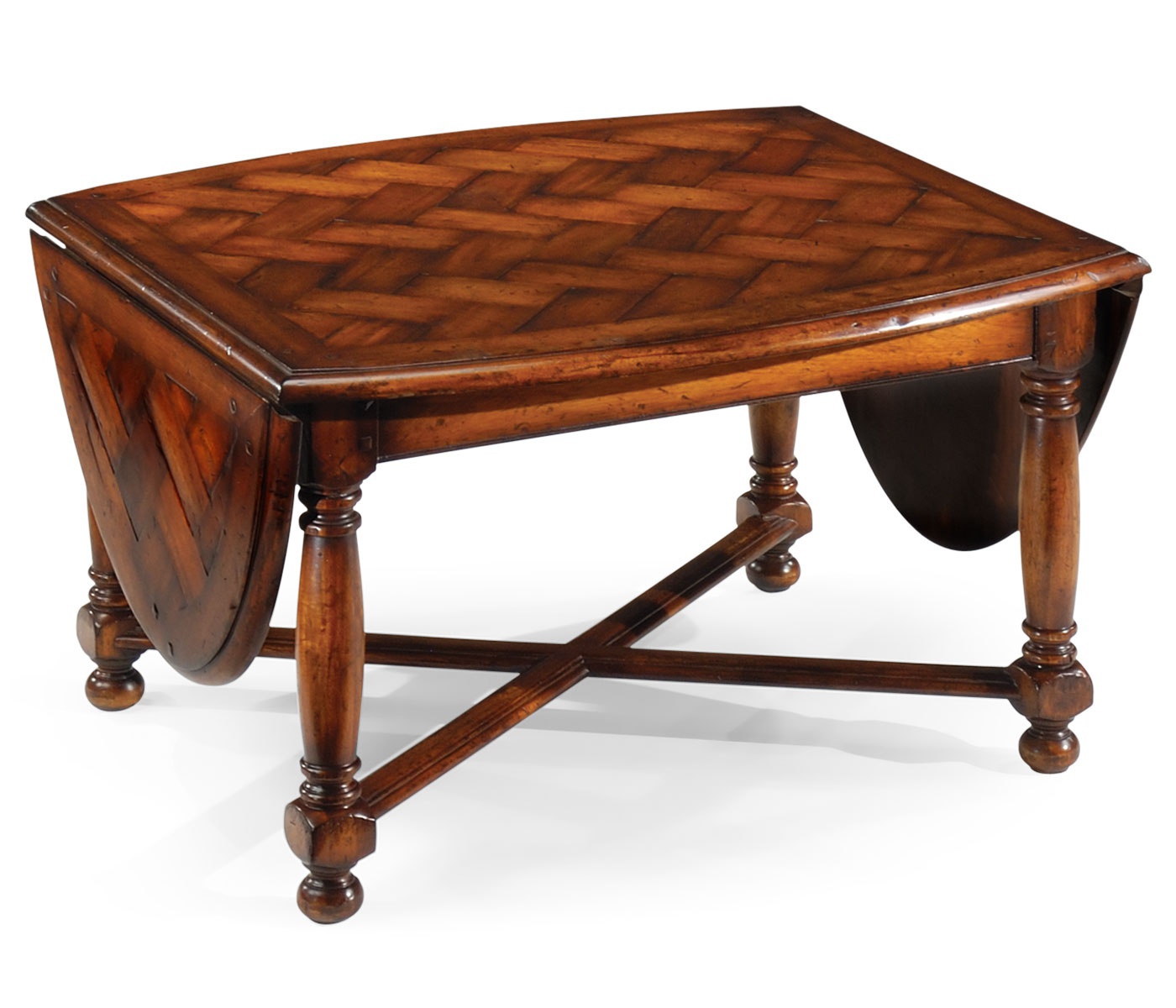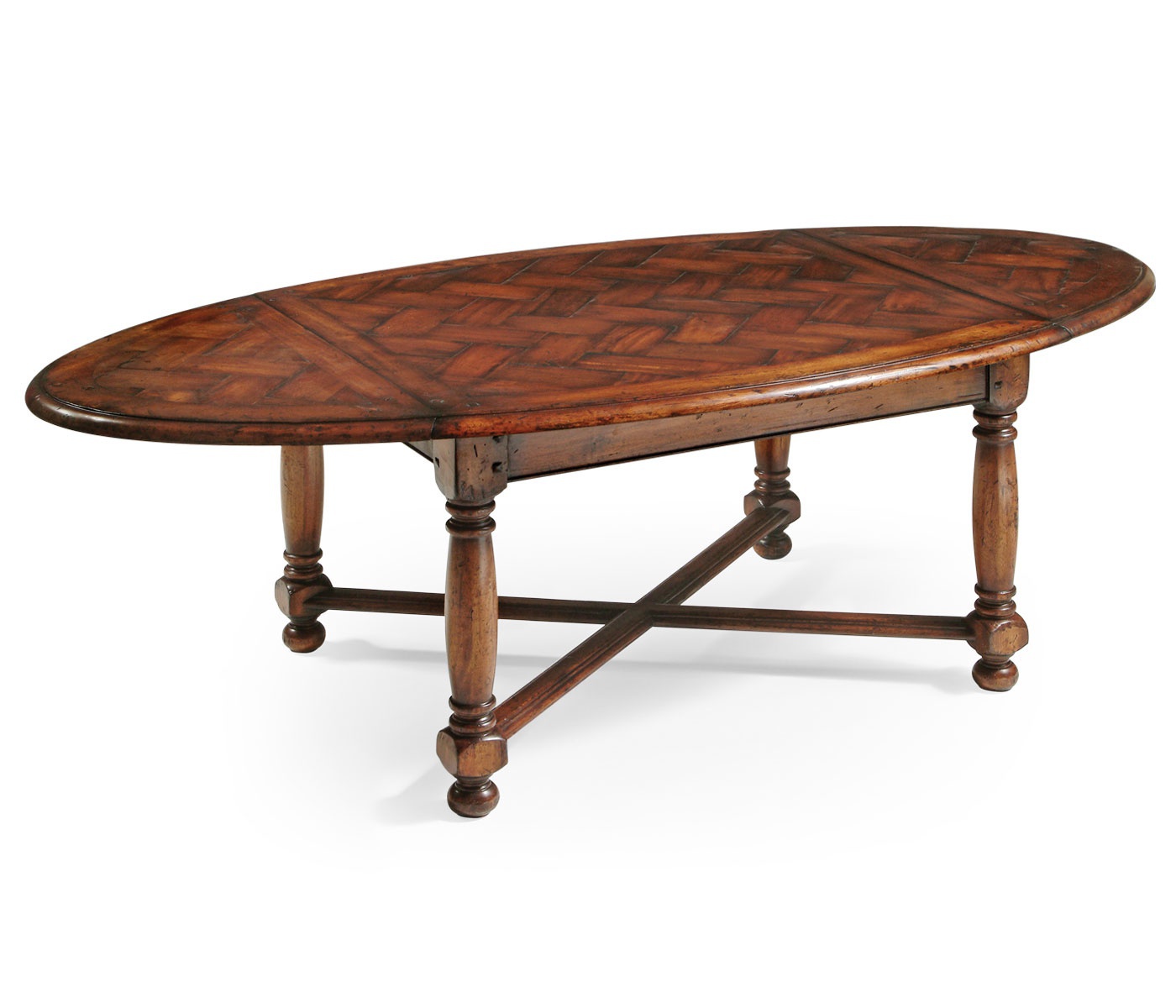 Coffee table Country Farmhouse from the American manufacturer Jonathan Charles. The counter is made of parquet boards and rests on a baluster. Folding oval model in country style.