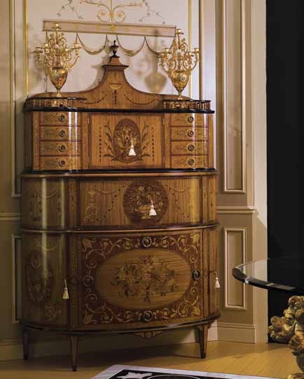 A chest of drawers from Italian manufacturer Ezio Bellotti. Material - solid wood. The facade is richly decorated with intarsia veneer wood. Model with closed sections for storage. Side sections with drawers is supplemented with semi-circular shelves. A chic choice for your living room or office in a classic style. Colors: brown, natural color of the wood.