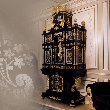 The buffet from the Italian manufacturer Ezio Bellotti. The material is solid wood. The model is decorated with luxurious decor. The facade, sides and pediment decorated with sculptures, carved details - all these elements are decorated by gilding. The model also inlaid with semiprecious stones. Includes several closed sections for storage. Original detail - pediment in the form of a turret clock, on which both parties are open shelves. A great choice for the living room in a classic style. Product color black.