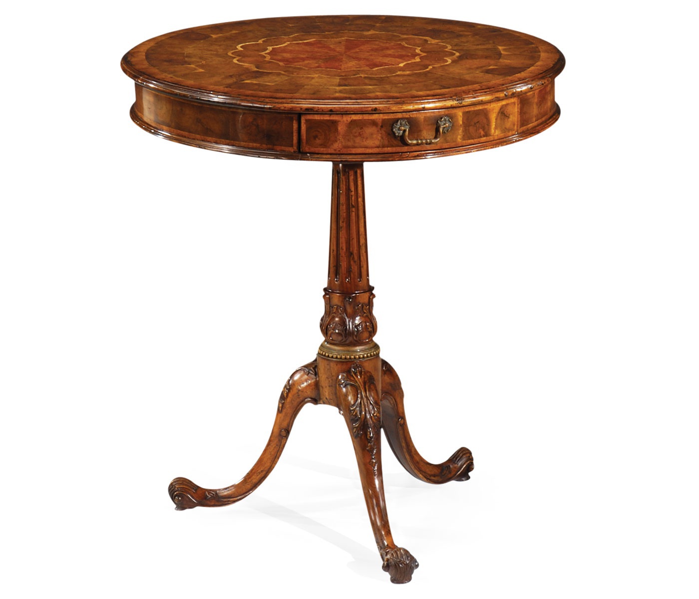 Table lamps Windsor from the American manufacturer Jonathan Charles. The model on the base with three legs and with a drawer. The top and legs are made of wood, handle and rim are made of brass. A table richly decorated with carving and marquetry.