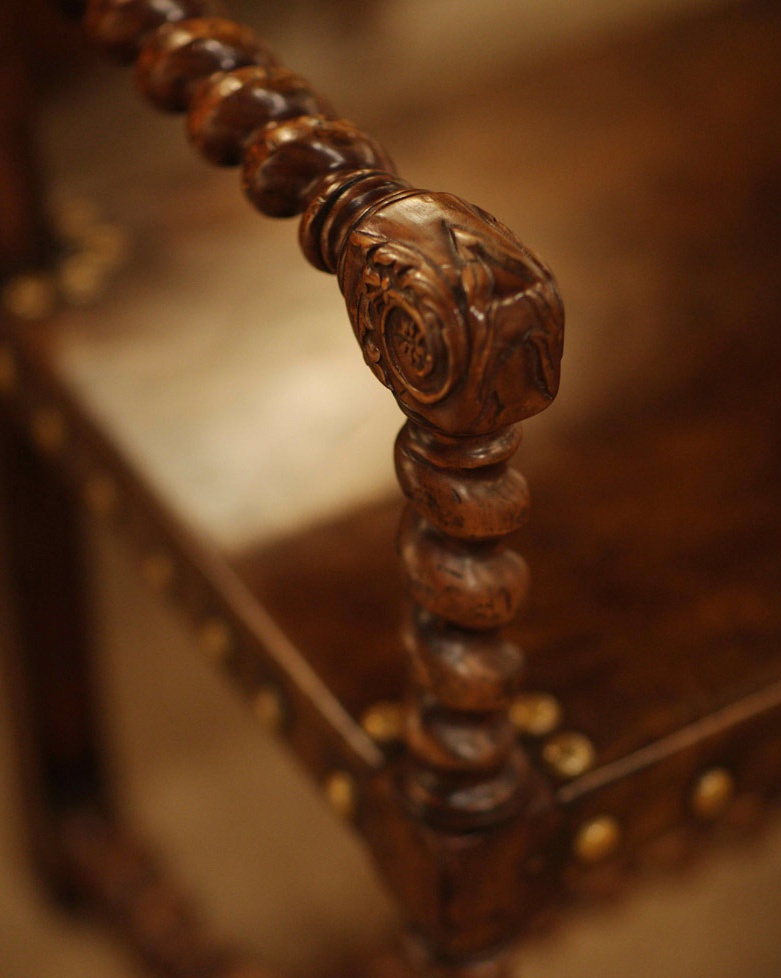 Bench Country Farmhouse from the American manufacturer Jonathan Charles. Double model with armrests and backrest. The bench is made of wood, the backrest and seat are covered with skin. Legs and armrests carved in the form of a twisted rod. Designed in country style.