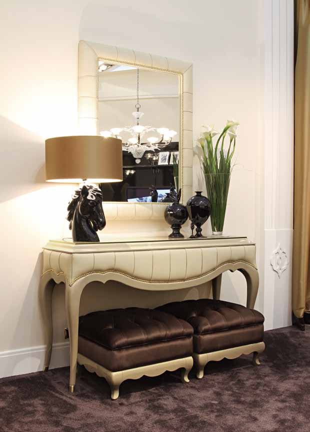 Console Ego from the Italian manufacturer Bruno Zampa. The Avantgarde Collection. The model is made from solid wood. Legs are carved, handmade. The tabletop is decorated with textile inlay and furniture nails. Finish - gloss lacquer. Colours in stock.
