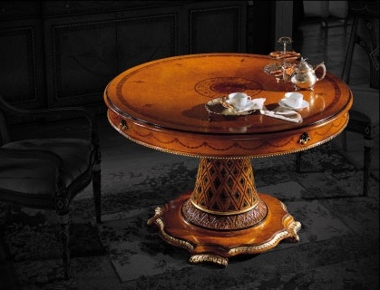 The table from the Italian manufacturer Ezio Bellotti. The material is solid wood. Round top is supported by a massive support column to figure the basis. The stem is richly decorated with carvings, the top decorated with intarsia. The model for the dining room in a classic style. The choice of color in stock.