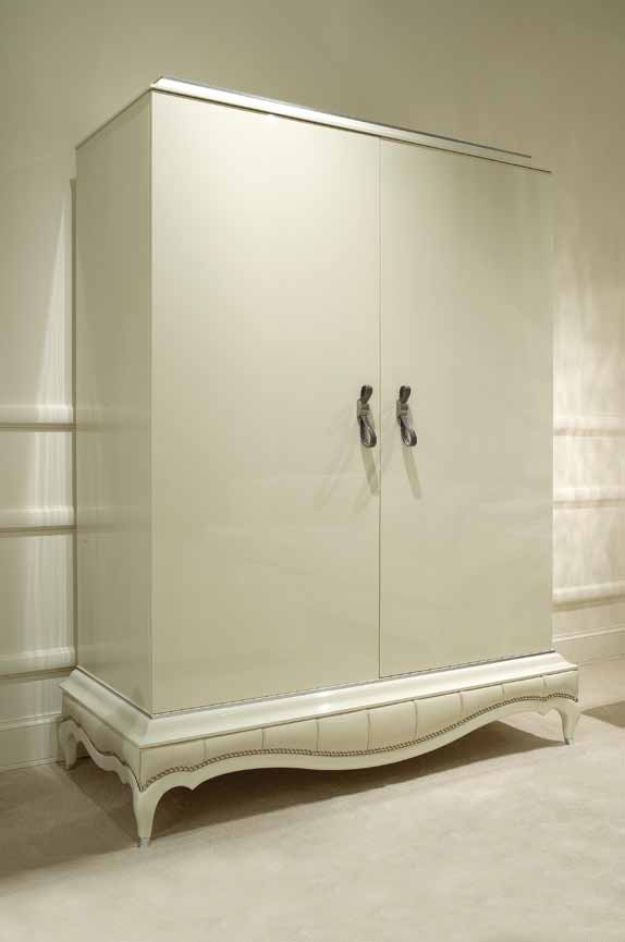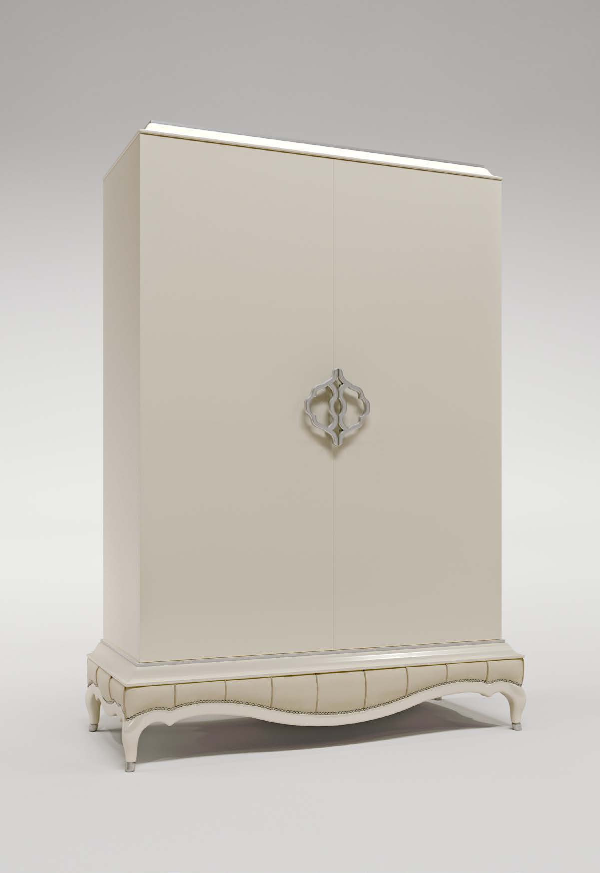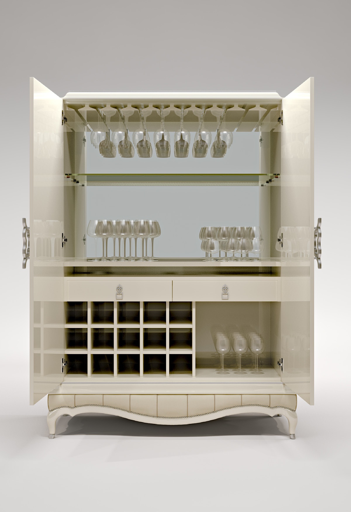 Bar Cabinet Ego from the Italian manufacturer Bruno Zampa. The Avantgarde Collection. The model is made from solid wood. Carving done by hand. The decor is enhanced with textile inserts and furniture nails. Finish - gloss lacquer. Colours in stock.