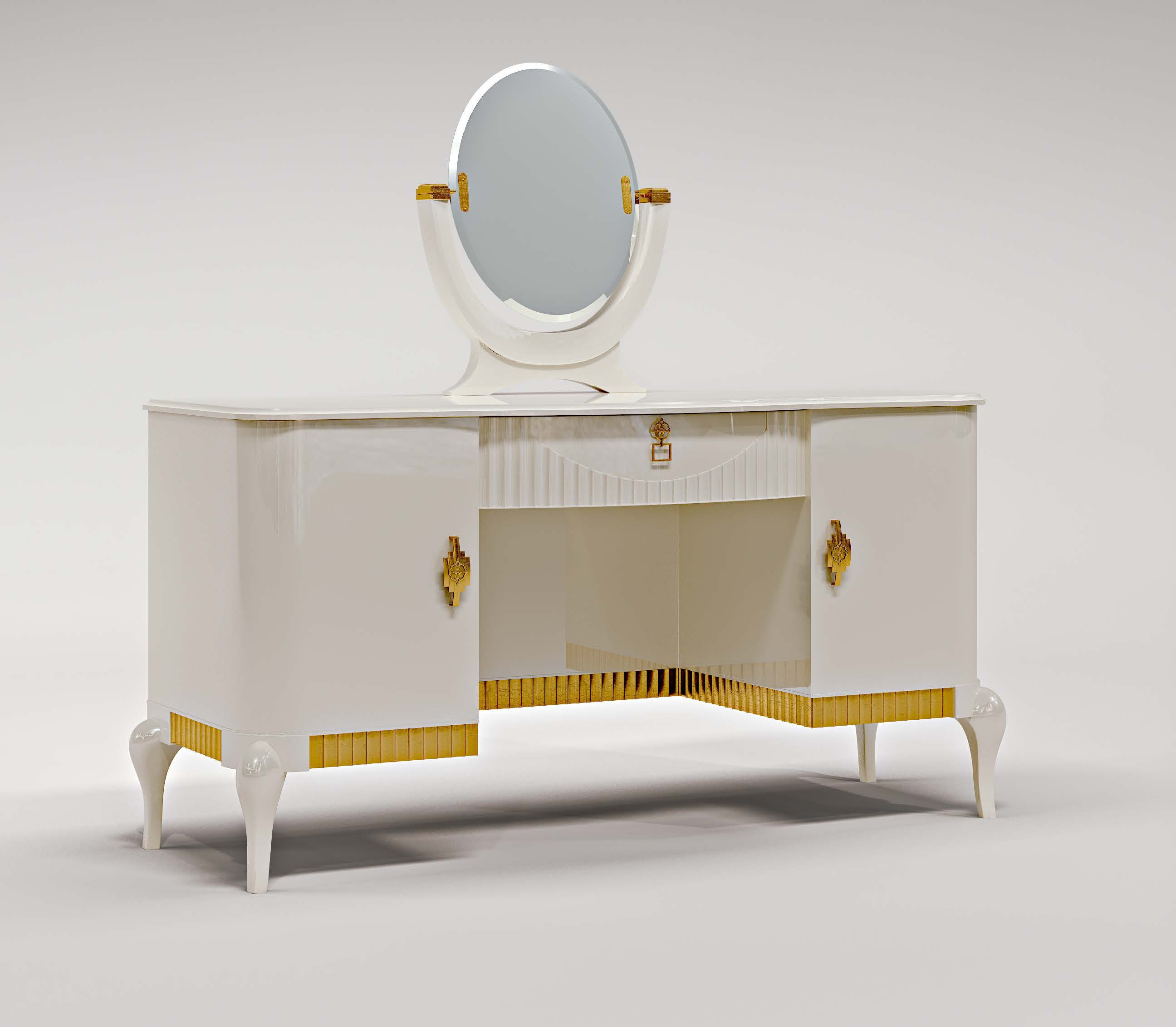 Dressing Vivien from the Italian manufacturer Bruno Zampa. The Avantgarde Collection. The model is made from solid wood. Handles from brass alloy. The table-top with a secret drawer for jewelry. Decorative elements: gold, cutters of wood on the sides. Colours in stock.