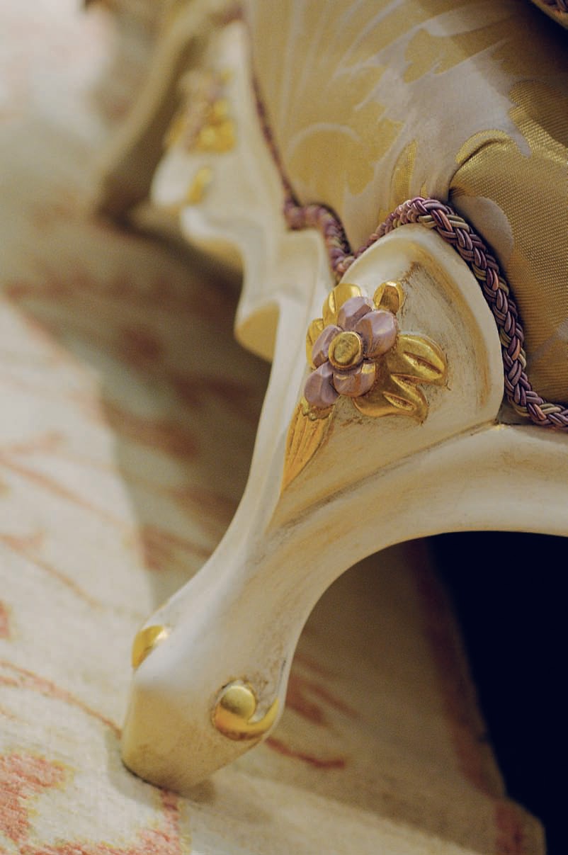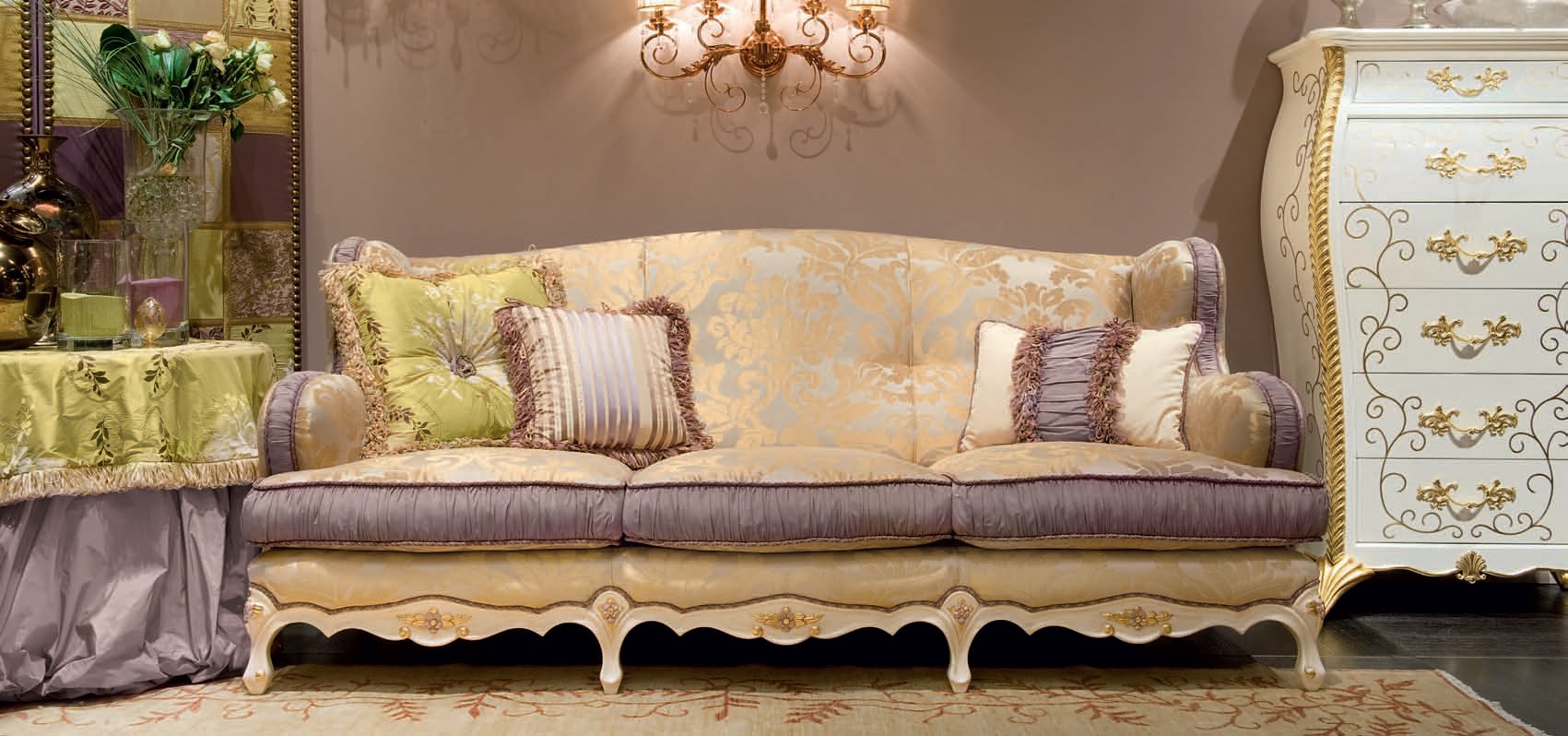 Three seater sofa Merlino from the collection Symphony of colours from the Italian manufacturer Bruno Zampa. Frame made of solid wood. Legs in a gilt finish, decorated with handmade carving. Upholstery textile. Colours in stock.
