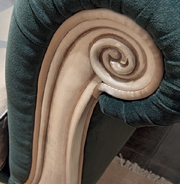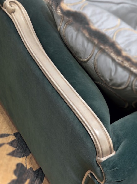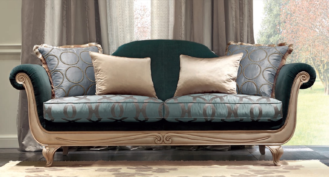 Three seater sofa Tosca from the Diamond collection from the Italian manufacturer Bruno Zampa. Frame of solid wood, decorated with handmade carving. Upholstery textile from the company portfolio. The seat and back, polyurethane foam and fluff. Colours in stock.