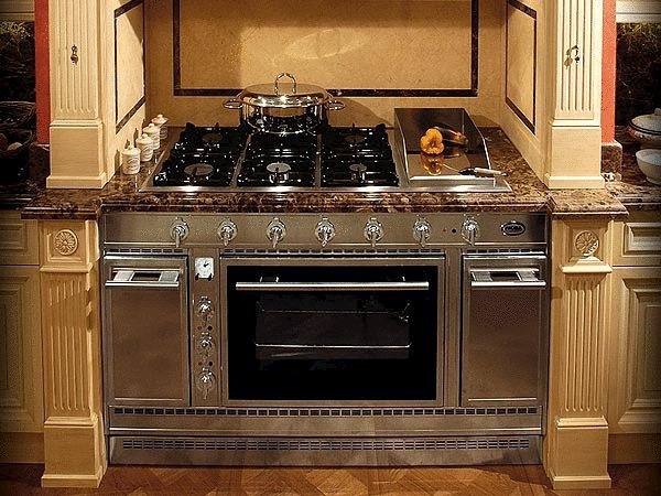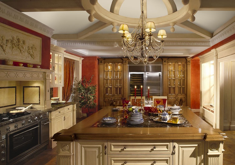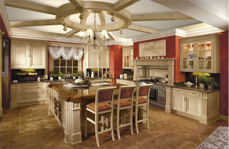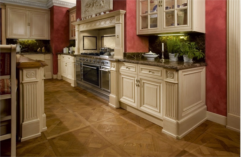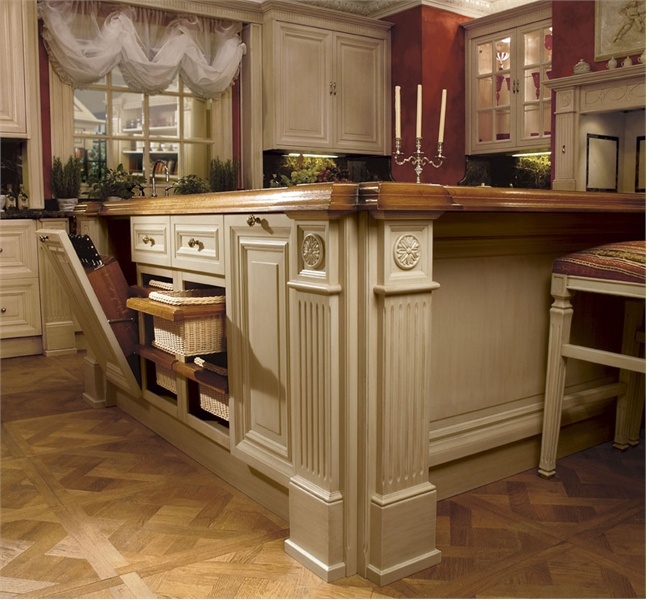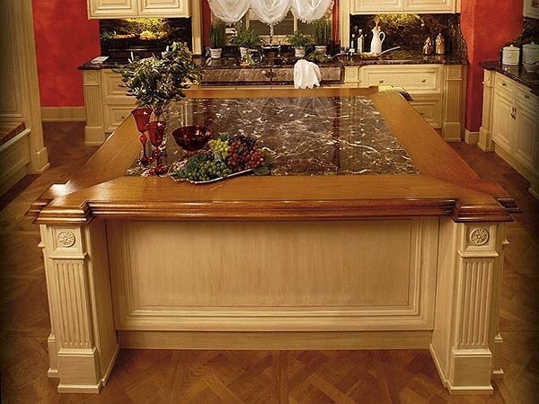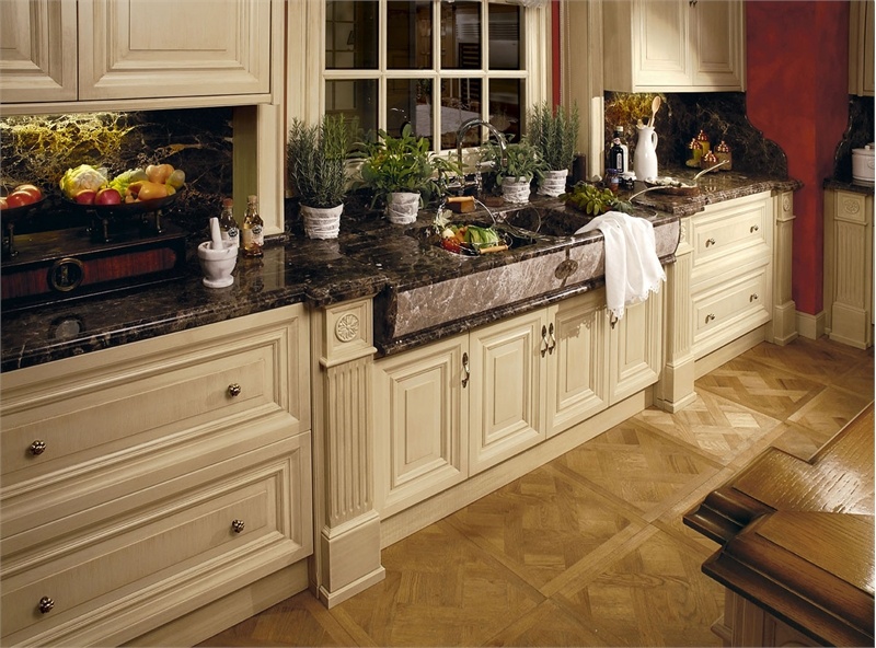 Exclusive cuisine from the Italian manufacturer Faoma. All the furniture is made by hand from natural materials. Wooden facades are decorated with friezes and a retractable pilasters, behind which are hidden storage system. Pilasters shall be nominated using the remote control. Marble sink with two bowls. The table top is made of wood or marble. Charming kitchen in a classic style. Product color ivory.