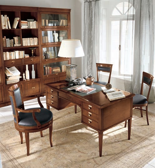 Headsets for office with bookcase Taormina from the Italian manufacturer Bizzotto. The presented model of working Desk with drawers on high legs, armchairs and chairs in leather upholstery, and walls with open shelves and cupboards with glass and wooden doors. Color in a dark tone wood. The classical solution for the interior of the Cabinet.