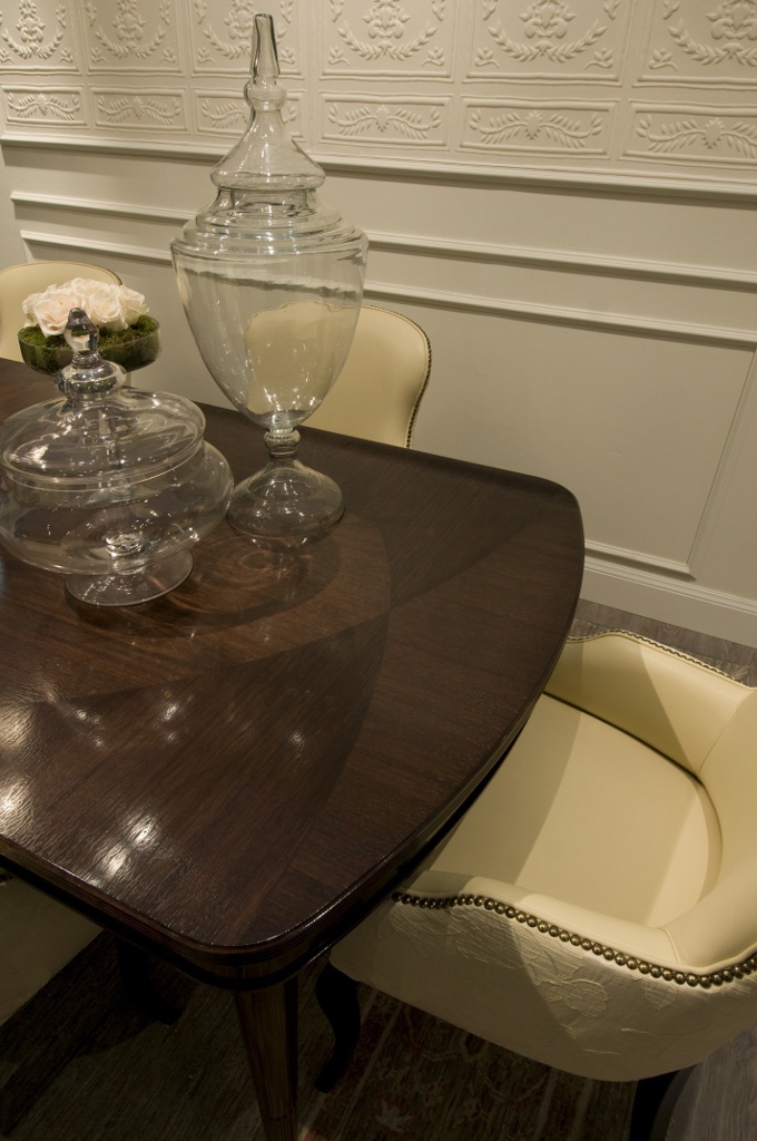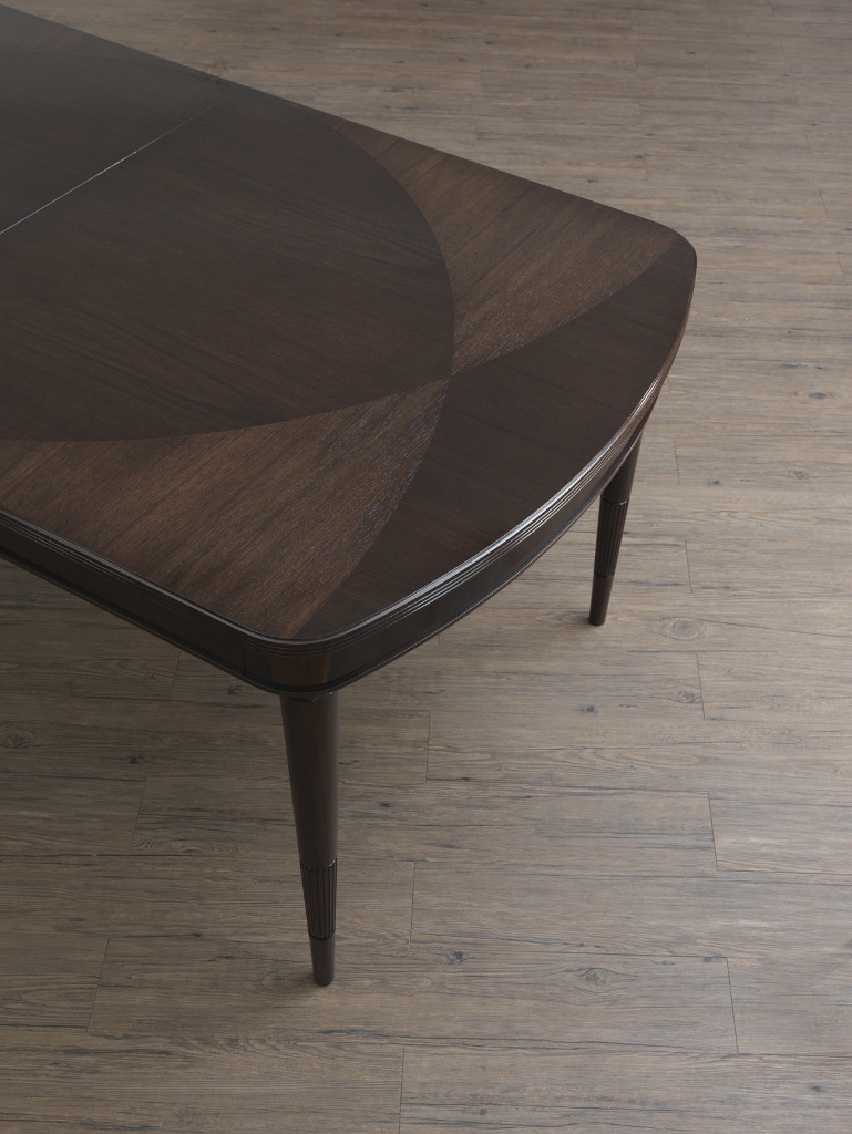 Rigoletto dining table from designer Fabio Crippa company Galimberti Nino. The frame of the table is made from solid American walnut, finished with varnish. The table top is decorated with inlay. Colours in stock. Great option with sliding table top for dining room in art Deco style.