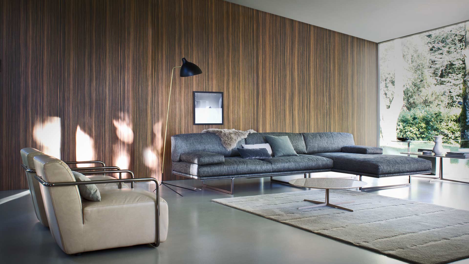 Blumun couch with metal legs Italian manufacturer Busnelli. The frame is made from metal, filled with goose feather and polyurethane foam. Upholstery - leather or fabric from a range of campaigns. The design of complementary decorative pillow. The model is designed for living room in modern style.