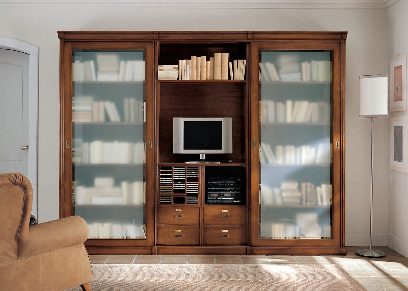 The wall for storing books and TV Taormina Italian manufacturer Bizzotto. Furniture on a wooden frame with doors coupe frosted glass. Wall with shelves for storing books and a module for TV. Color tone light wood. The perfect solution for the interior of the library or living room.